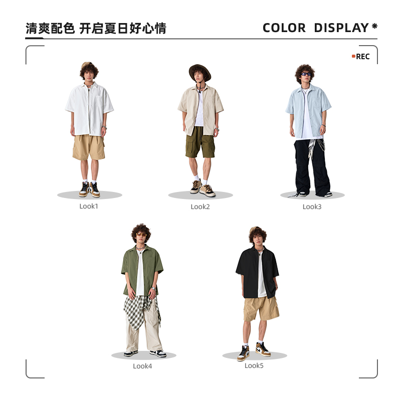 衬衫 休闲宽松高级男士 夏季 美式 衬衣潮H 新款 回力简约户外冰丝短袖