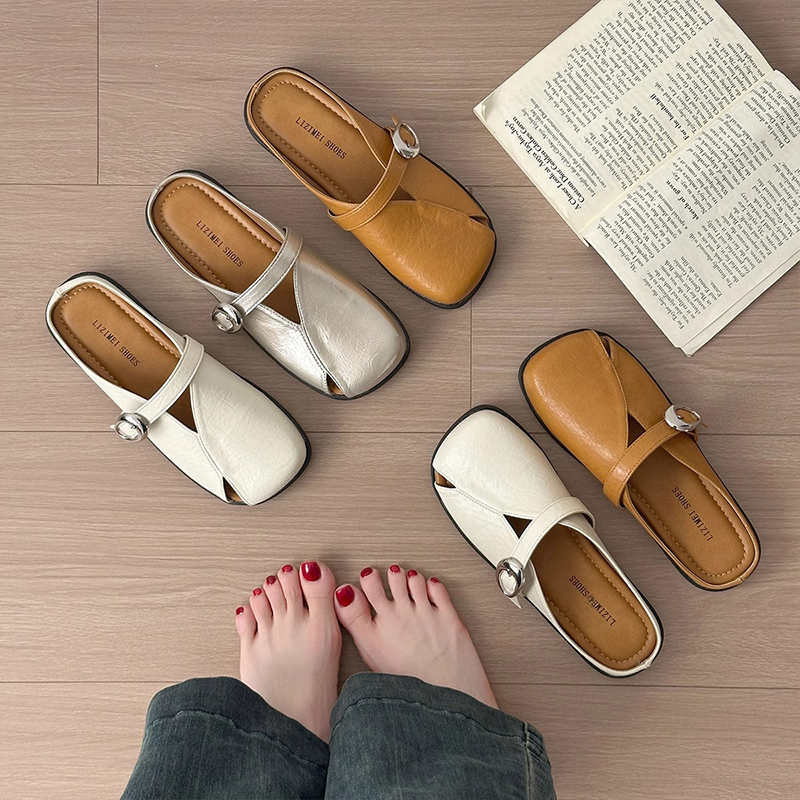新款 一脚蹬懒人凉鞋 法式 女外穿百搭平底时尚 包头半拖鞋 2025年夏季