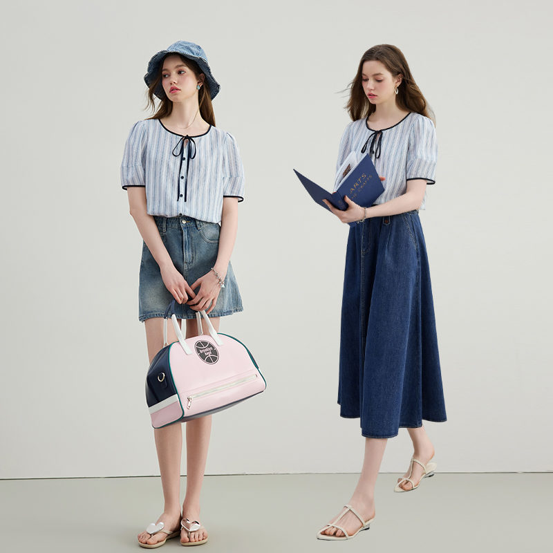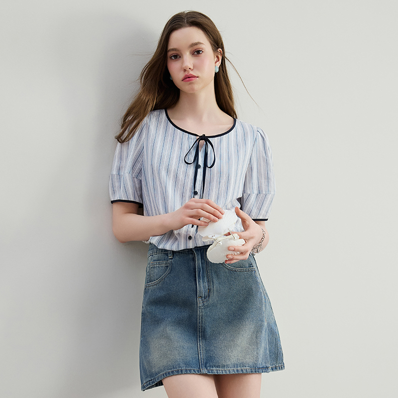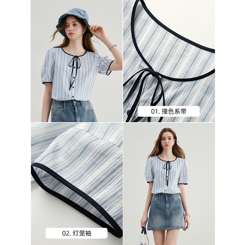 衬衫 时尚 女蓝色灯笼袖 新款 洋气上衣 设计气质衬衣2025夏季 KBNE短袖