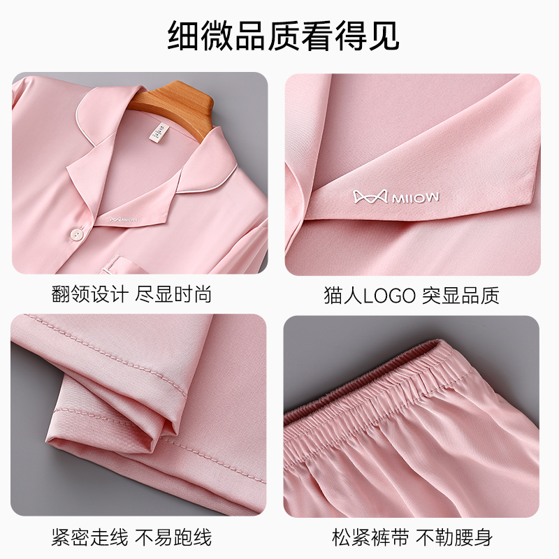 高级感仿真丝家居服新款 凉感缎面短袖 夏季 猫人冰丝睡衣三件套女款