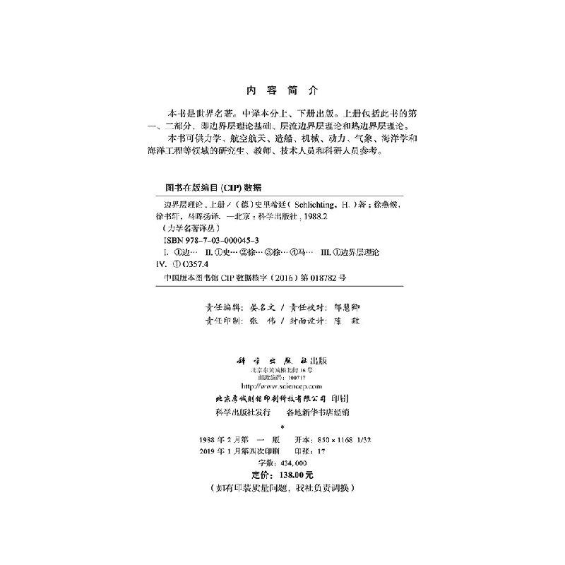 徐燕侯译科学出版 边界层理论 H.史里希廷 德 社 上册