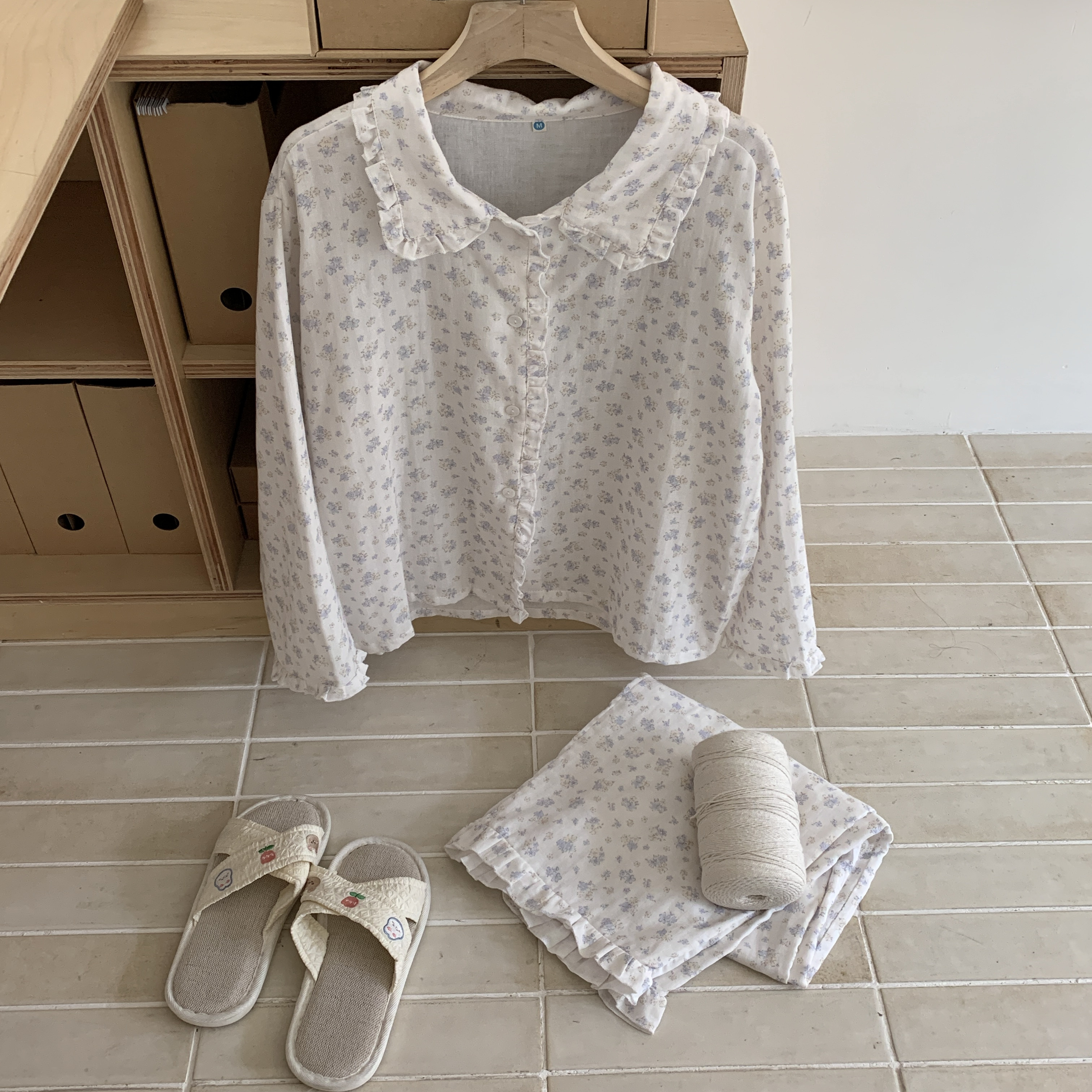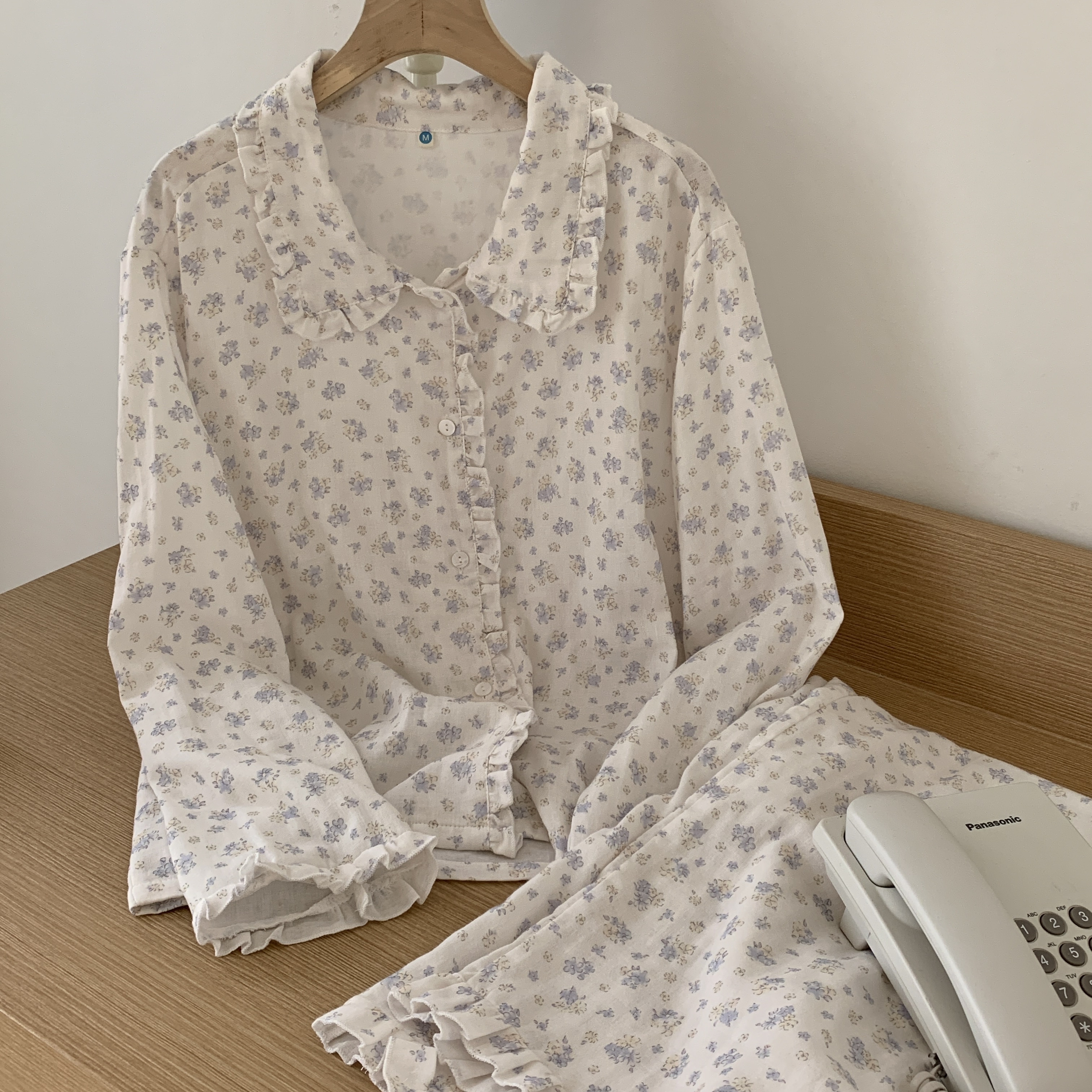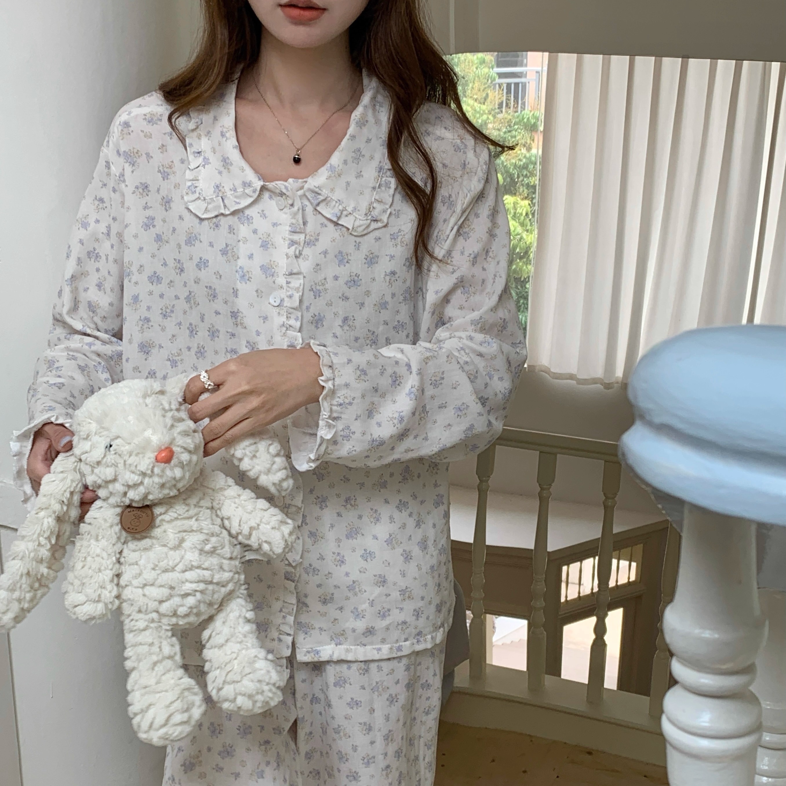 睡衣娃娃领家居服可外穿 长裤 新品 a类全棉双层纱布碎花花边长袖
