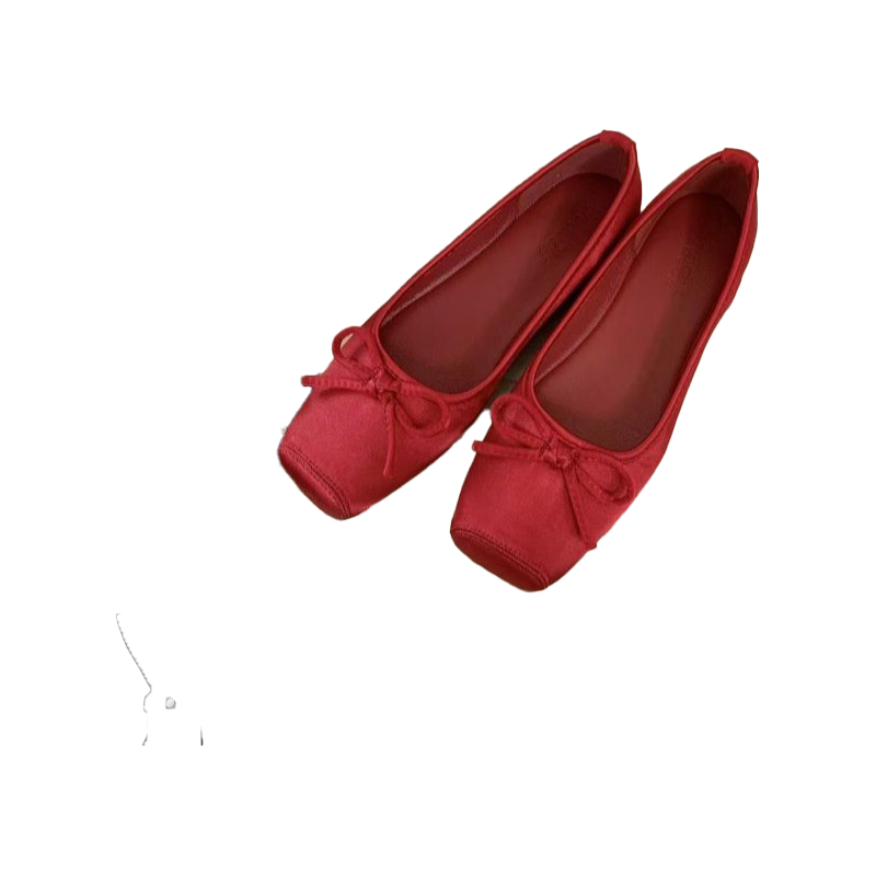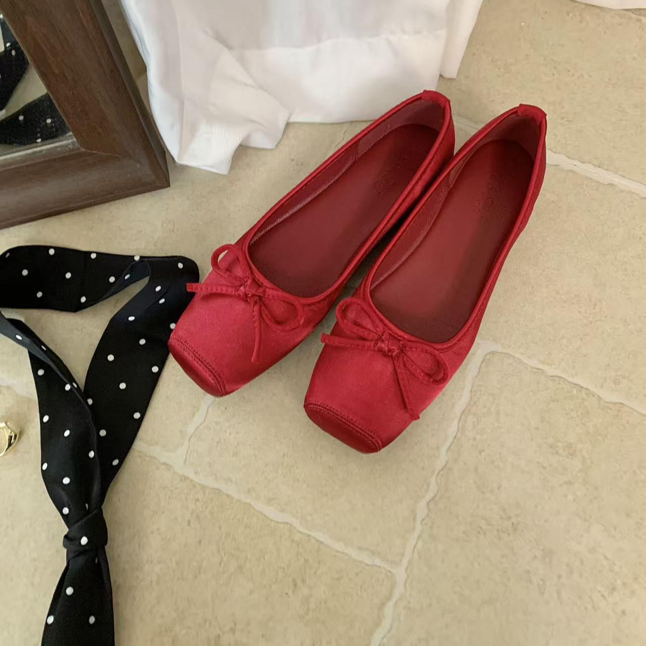 软底猪鼻小红鞋 仙女风蝴蝶结绸缎方头浅口芭蕾舞单鞋 女2025新款