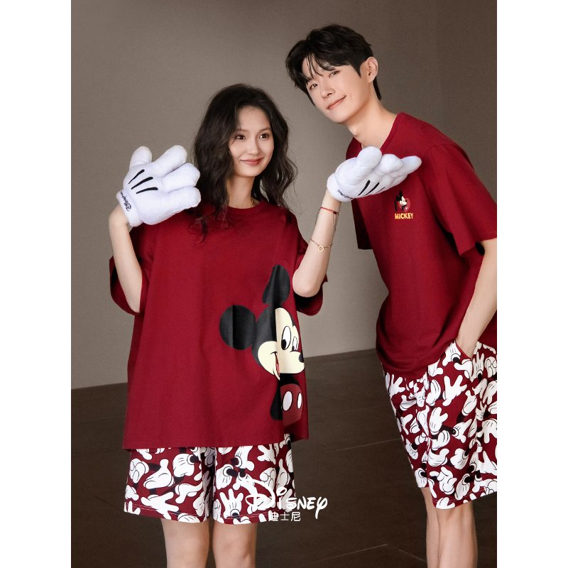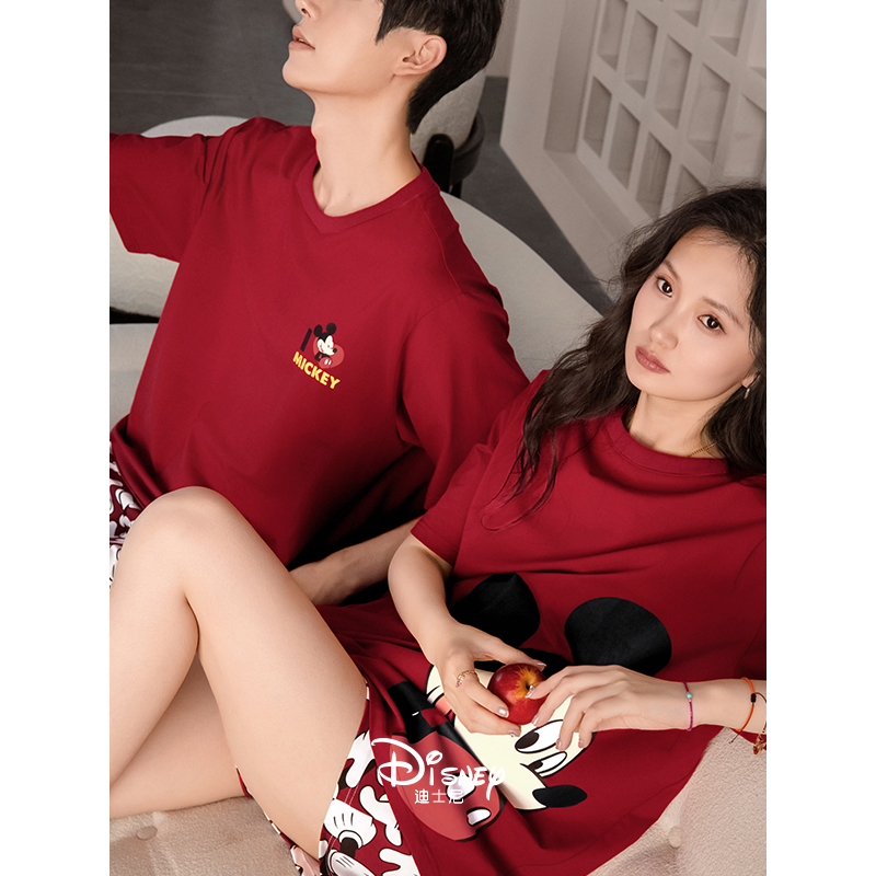 男女新婚红色家居服 套装 迪士尼系列情侣睡衣夏季 可爱米奇纯棉短袖