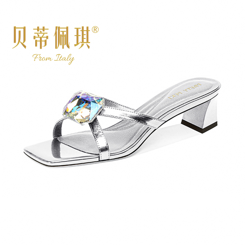 细带水钻中高跟凉拖鞋 时尚 新款 女2025年夏季 方头露趾粗跟外穿拖鞋