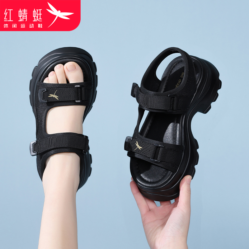 2025新款 红蜻蜓女鞋 女款 凉鞋 外穿 黑色厚底增高女士运动休闲沙滩鞋