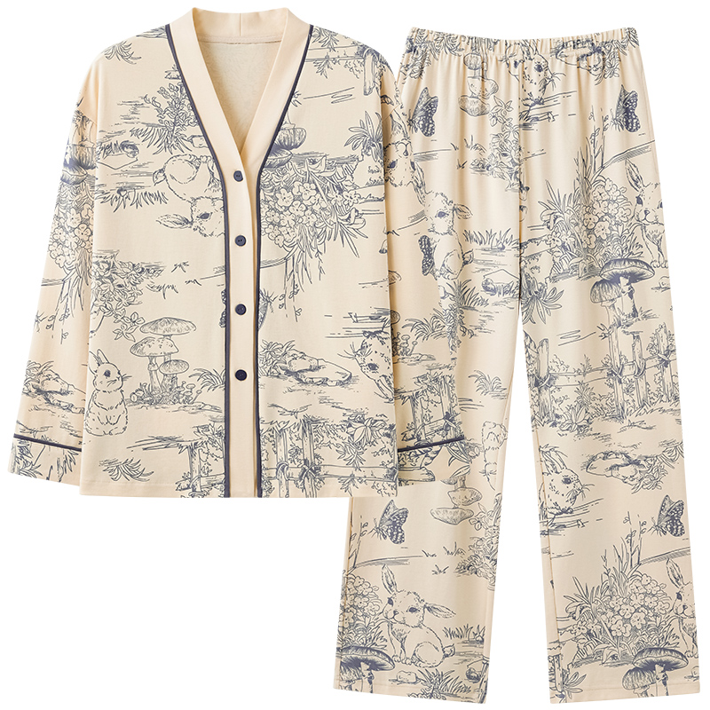全棉休闲家居服套装 带胸垫长袖 秋春2025新款 都市丽人纯棉睡衣女款
