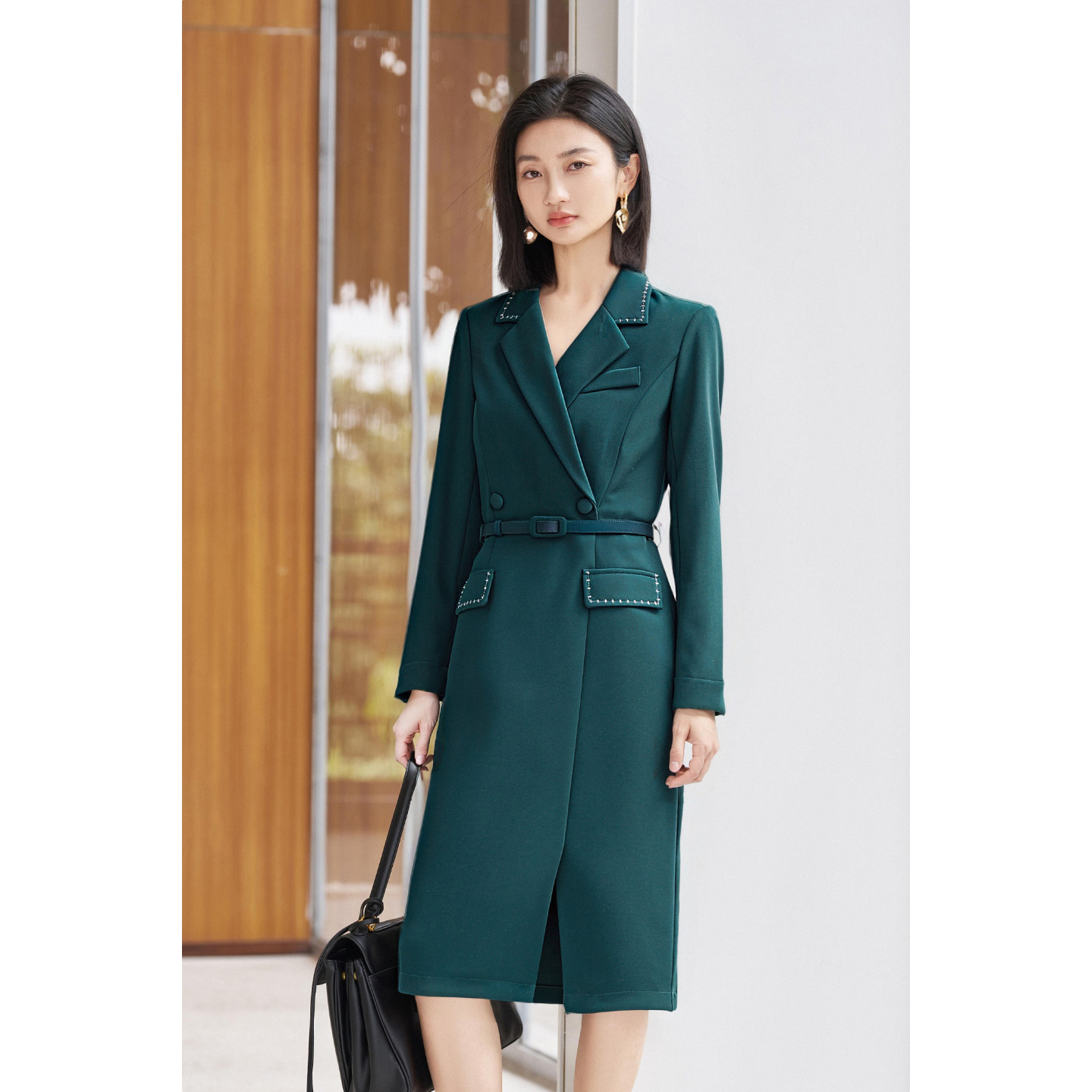 时尚 提花连衣裙2025新款 气质显瘦中长裙子 长袖 宝诗黎翻领钉珠秋季
