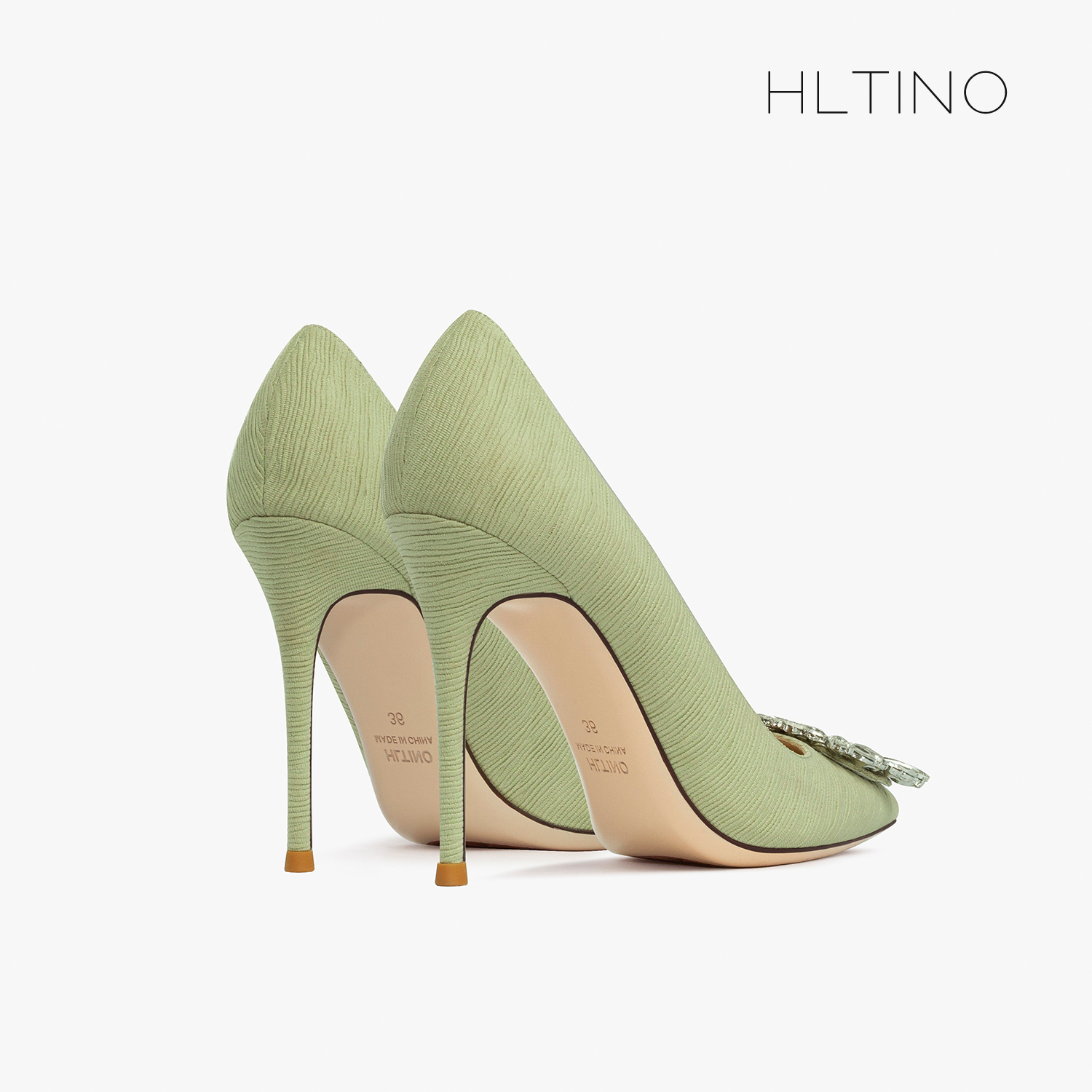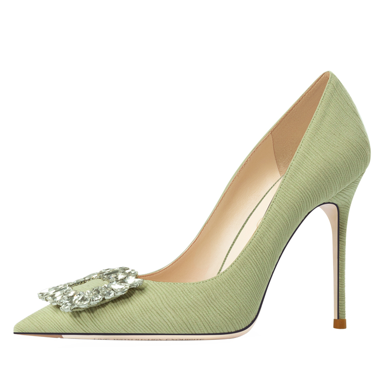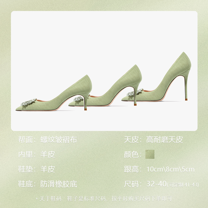 婚鞋 2025年新款 大小码 女细跟绿色水钻方扣单鞋 夏41一43 尖头高跟鞋