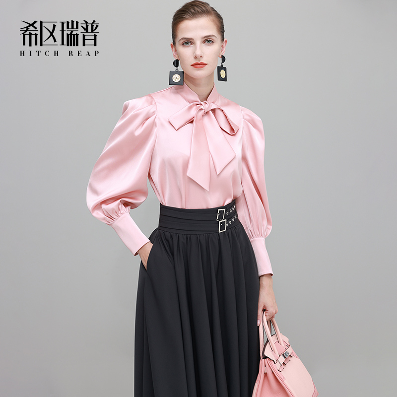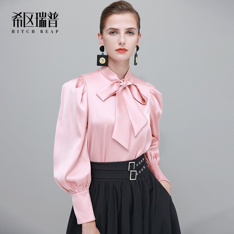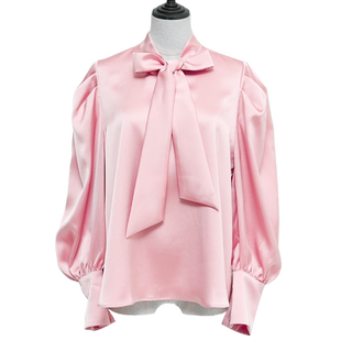 女新初春泡泡袖 衬衫 别致纯色气质衬衣 法式 希区瑞普飘带领长袖