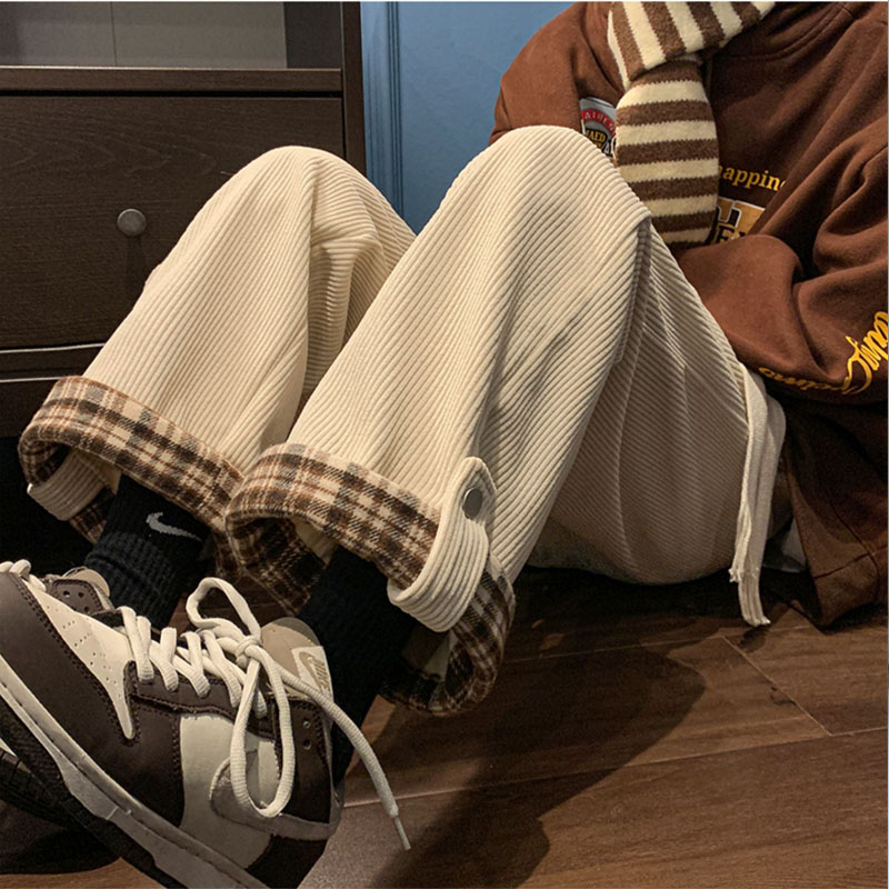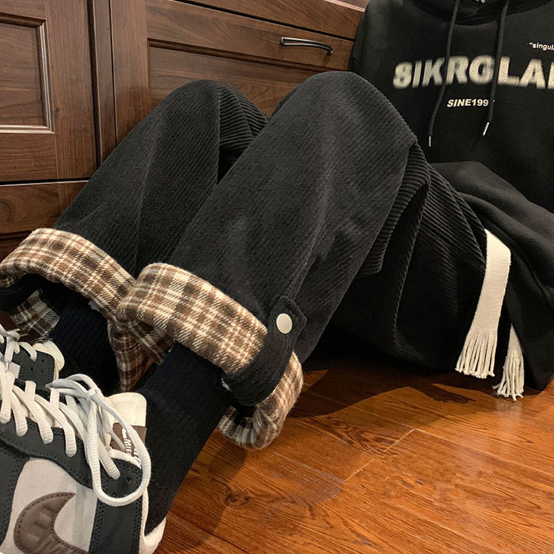 高腰垂感宽松加绒直筒小个子翻边格子休闲裤 灯芯绒阔腿裤 女春秋季