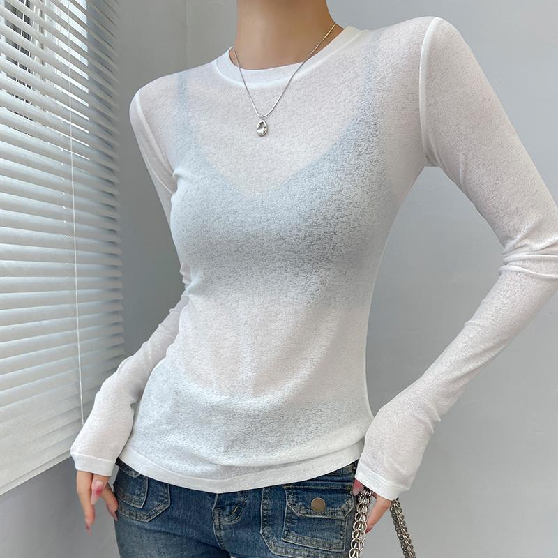 冰海蓝色圆领时尚 女秋冬内搭可外穿微透独特漂亮上衣薄 洋气打底衫