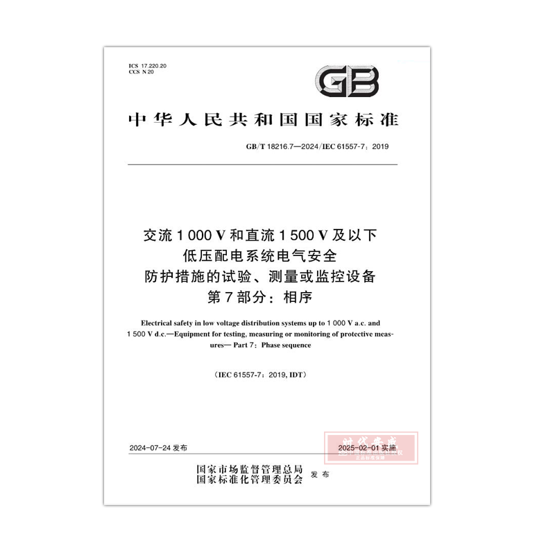 交流1000V和直流1500V及以下低压配电系统电气安全 第7部分:相序 测量或监控设备 试验 防护措施 2024 18216.7 正版