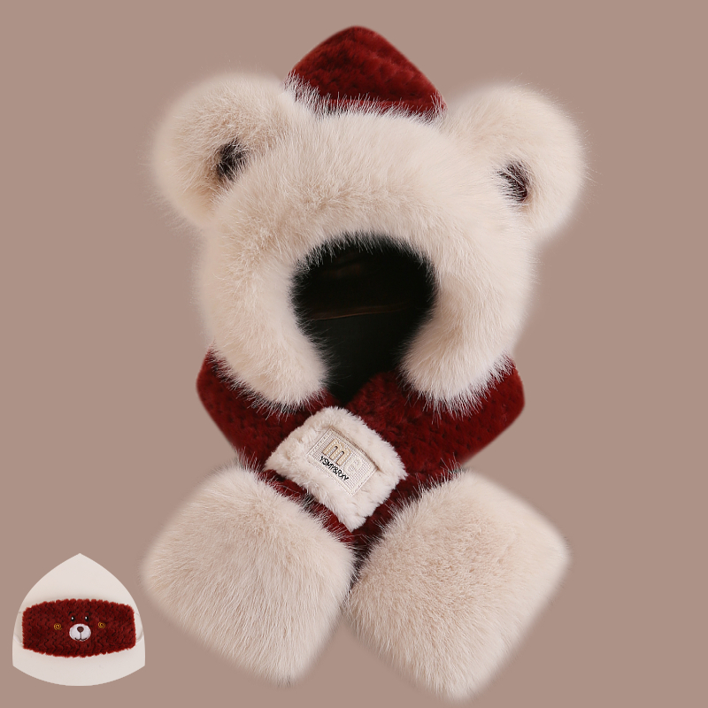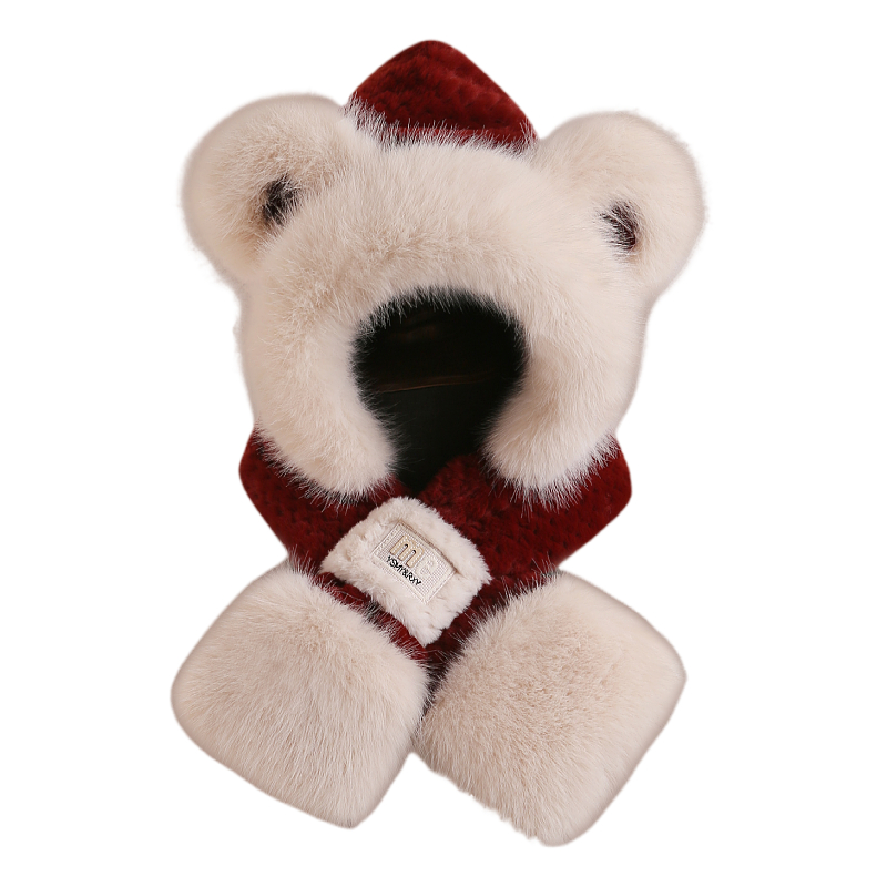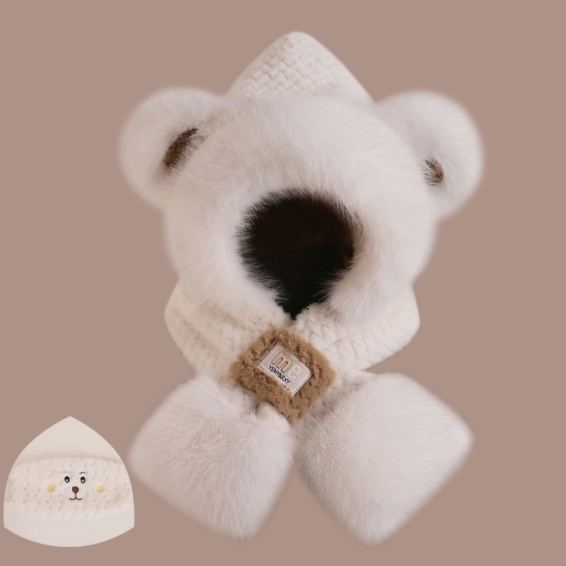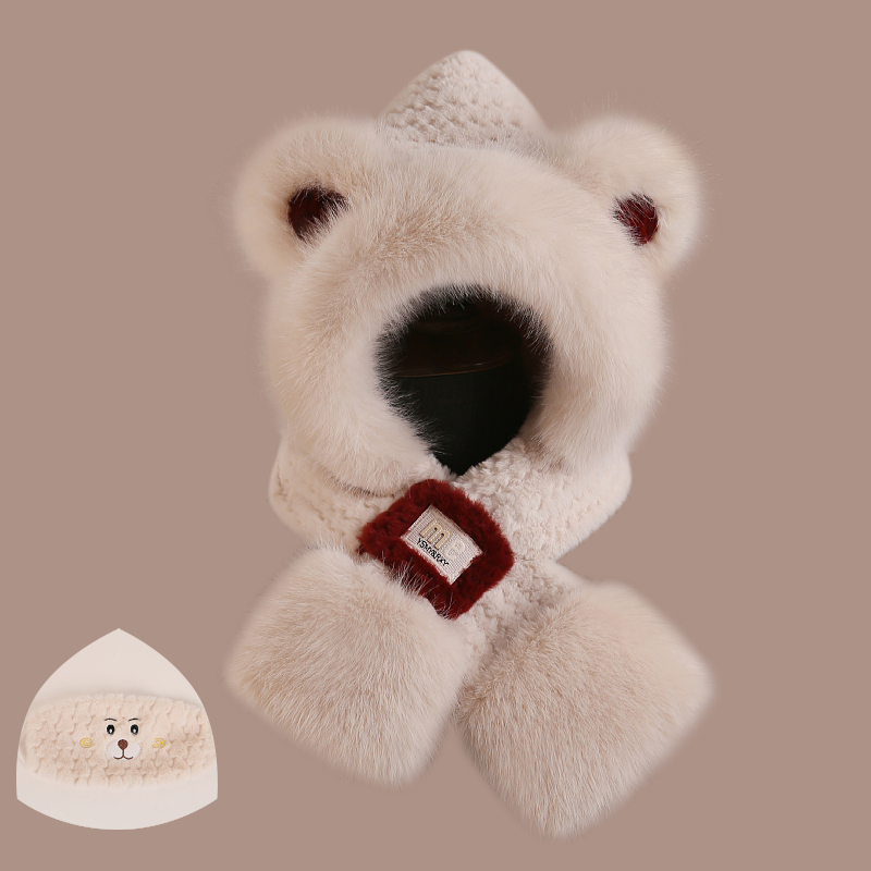 可爱小熊帽子围巾一体女新款 加绒围脖防寒保暖毛茸茸护耳帽 秋冬季