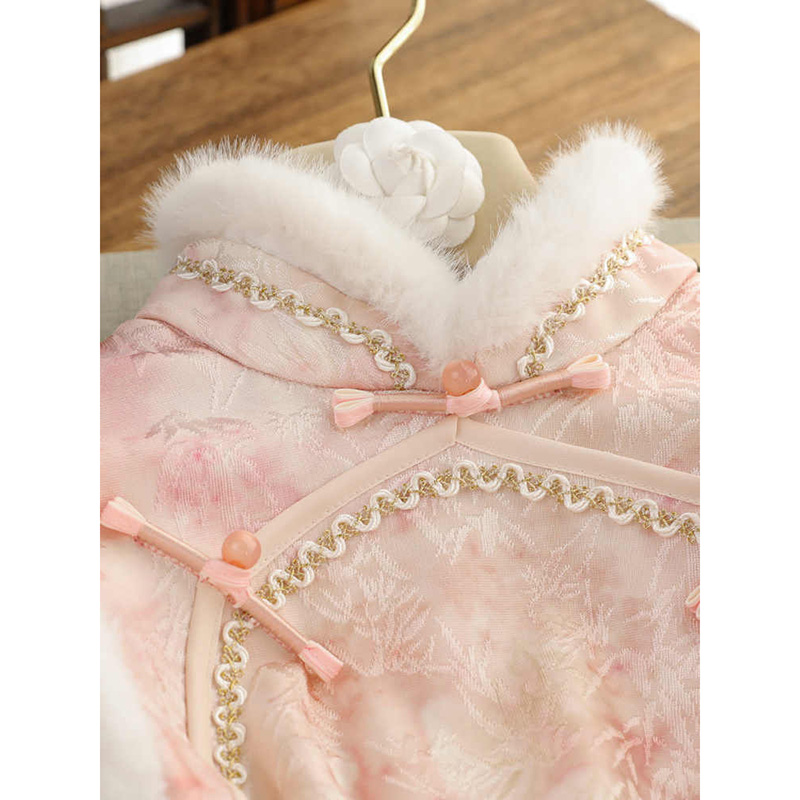 连衣裙 粉色淑女旗袍加绒保暖毛绒领日常可穿新中式 2025年冬季 新款