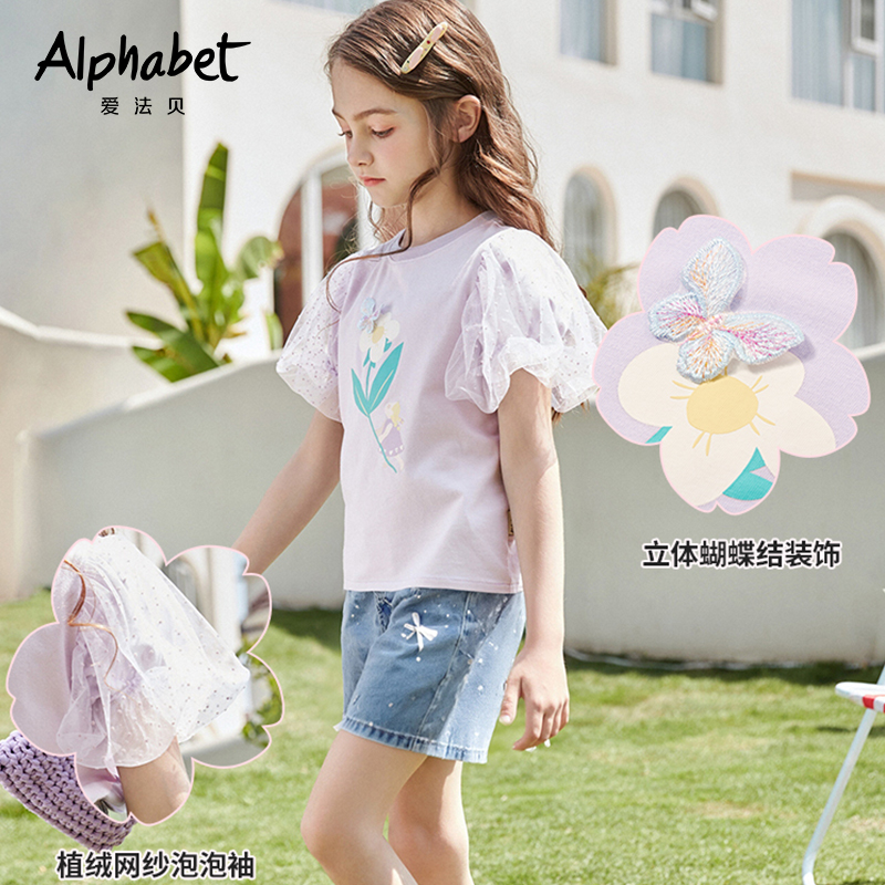 中大儿童网纱体恤泡泡袖 t恤2025新款 洋气上衣 女童短袖 爱法贝夏装