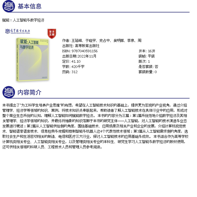 王延峰 工程技术人员和管理人员参考阅读书籍 著 高等教育出版 9787040591156 赋能 社 人工智能与数字经济
