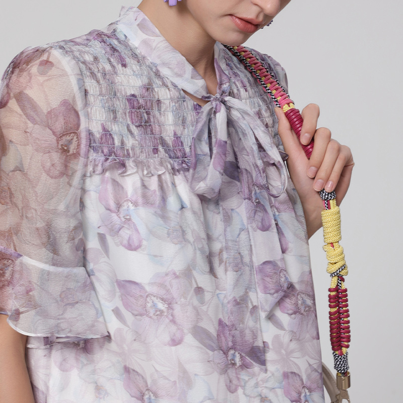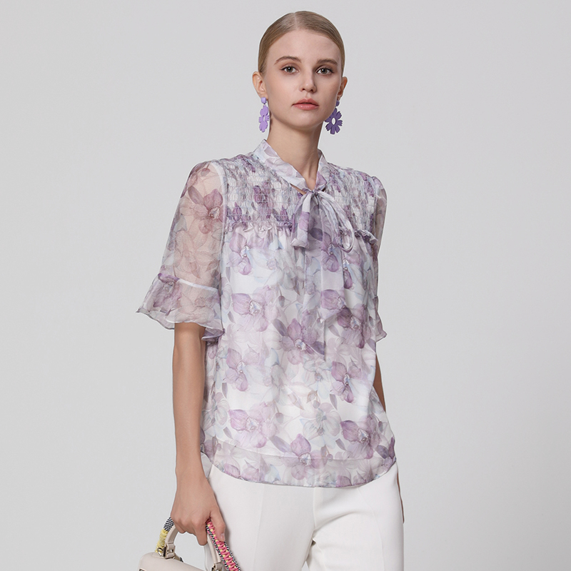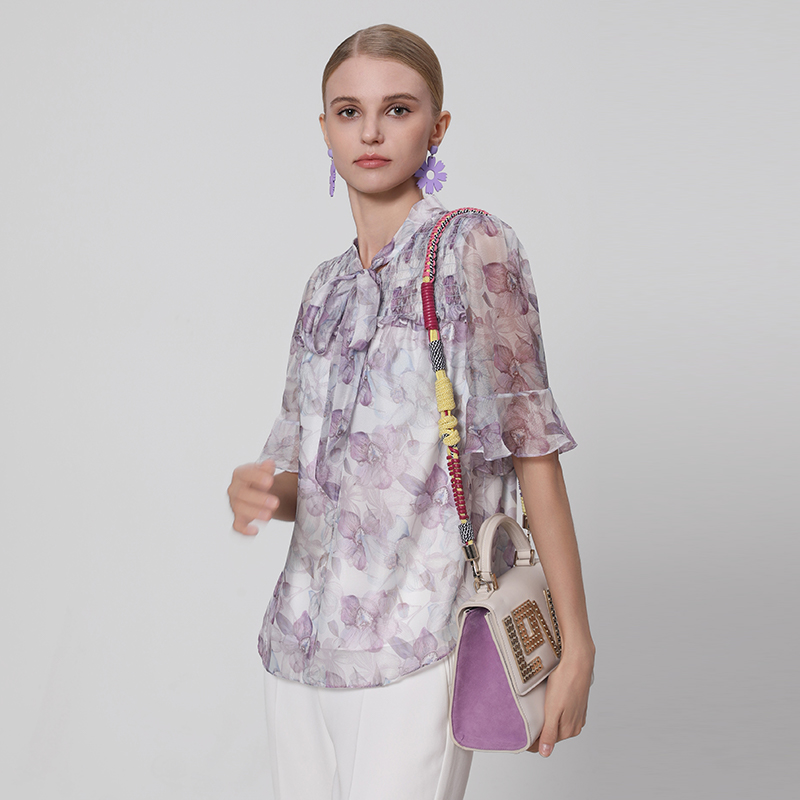 马天奴夏季 时尚 新款 衬衫 紫色绑带领印花雪纺上衣女装 专柜正品