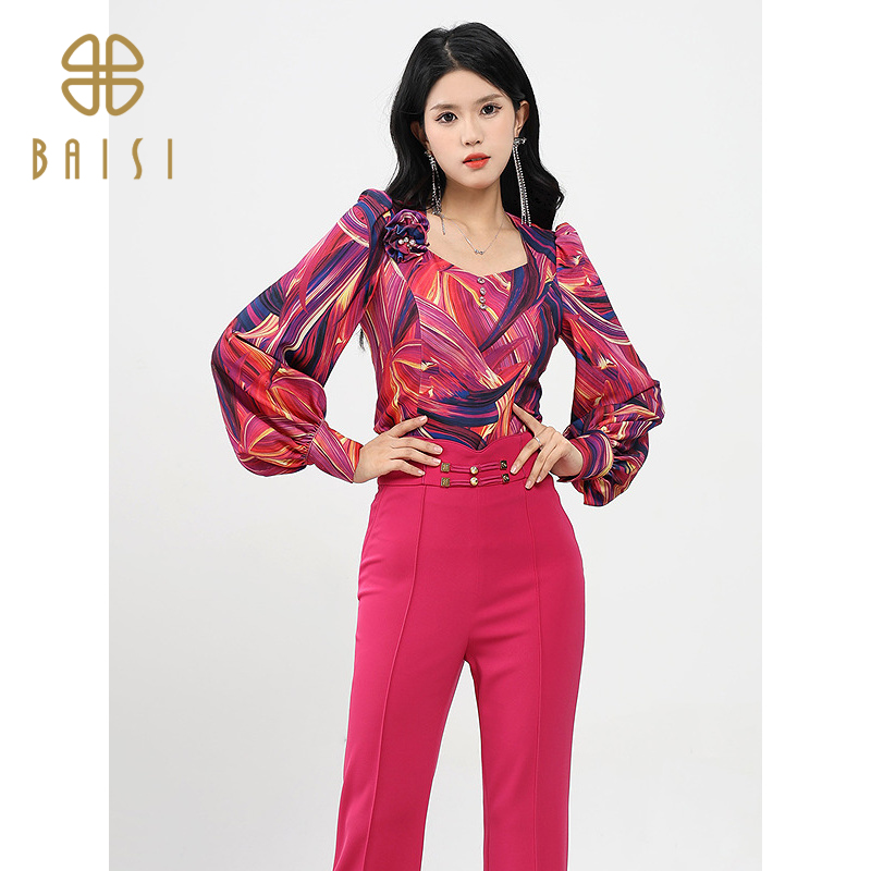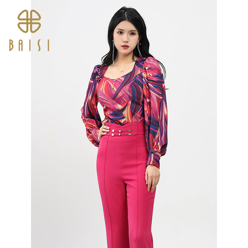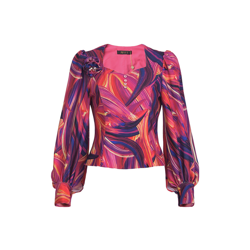 复古修身 时尚 长袖 新品 抽象涂鸦方领上衣女 衬衣2025春季 百丝美式