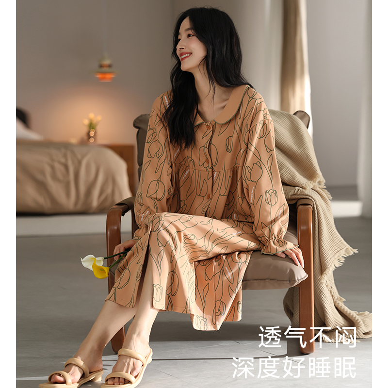 宽松连衣裙 高级感长袖 猫人睡裙睡衣女春秋款 纯棉慵懒风家居服法式