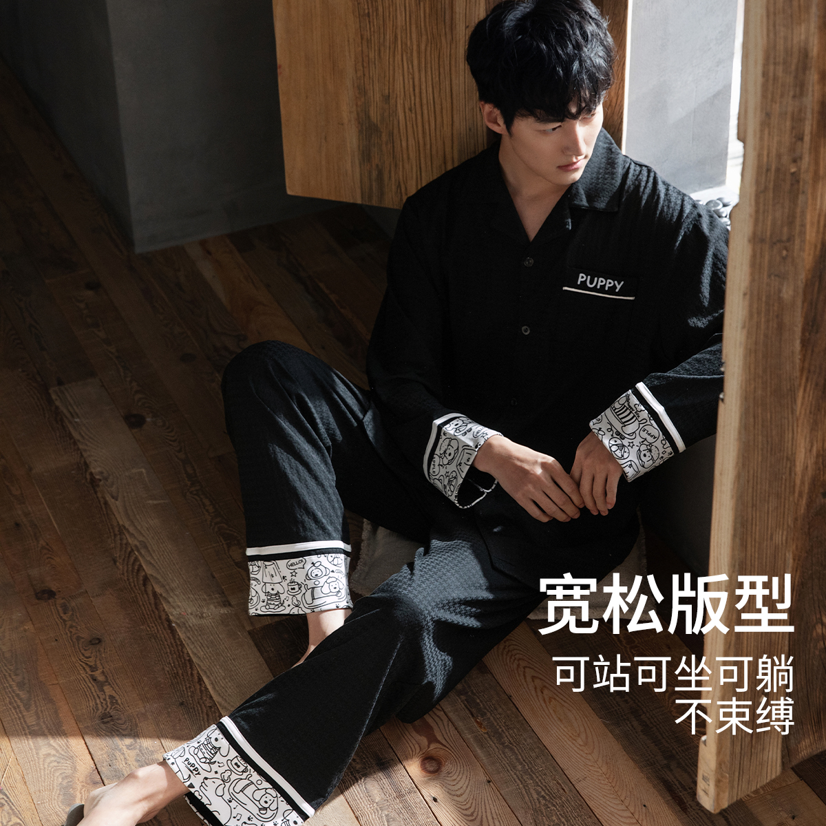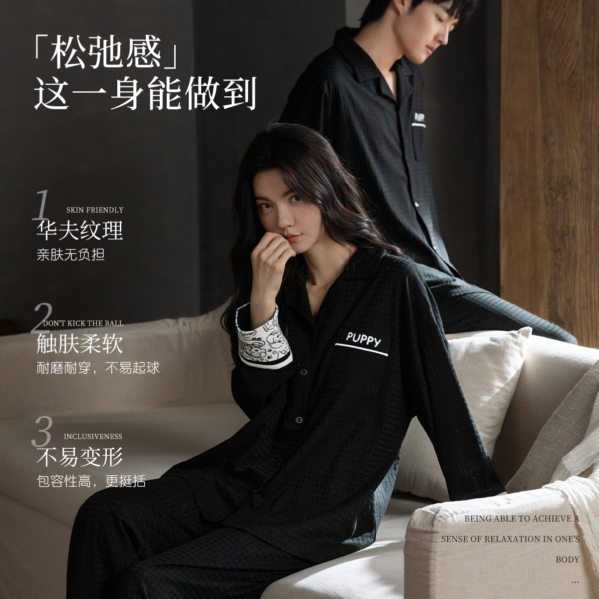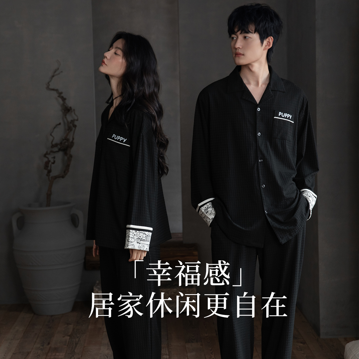 黑色高级感男家居服套装 乐姿梦25年情侣睡衣女春秋季 针织棉质长袖