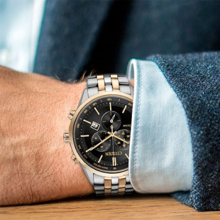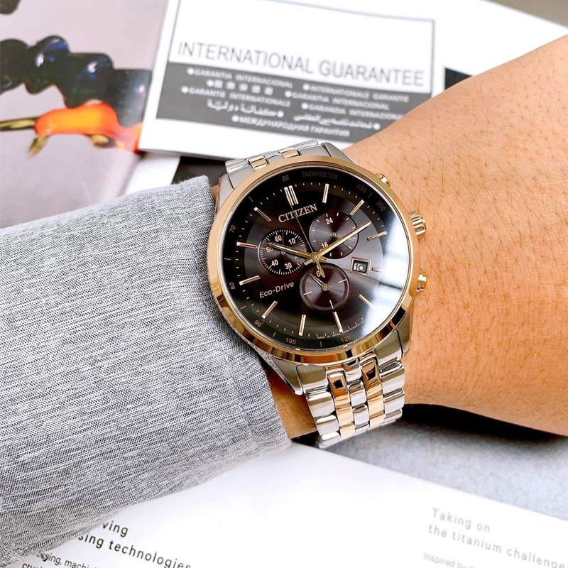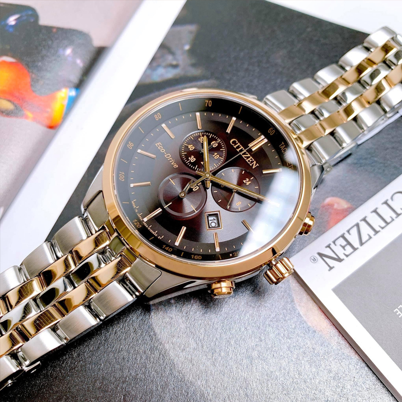 Citizen 54E 西铁城光动能不锈钢间玫瑰金色表带多功能男表AT2144
