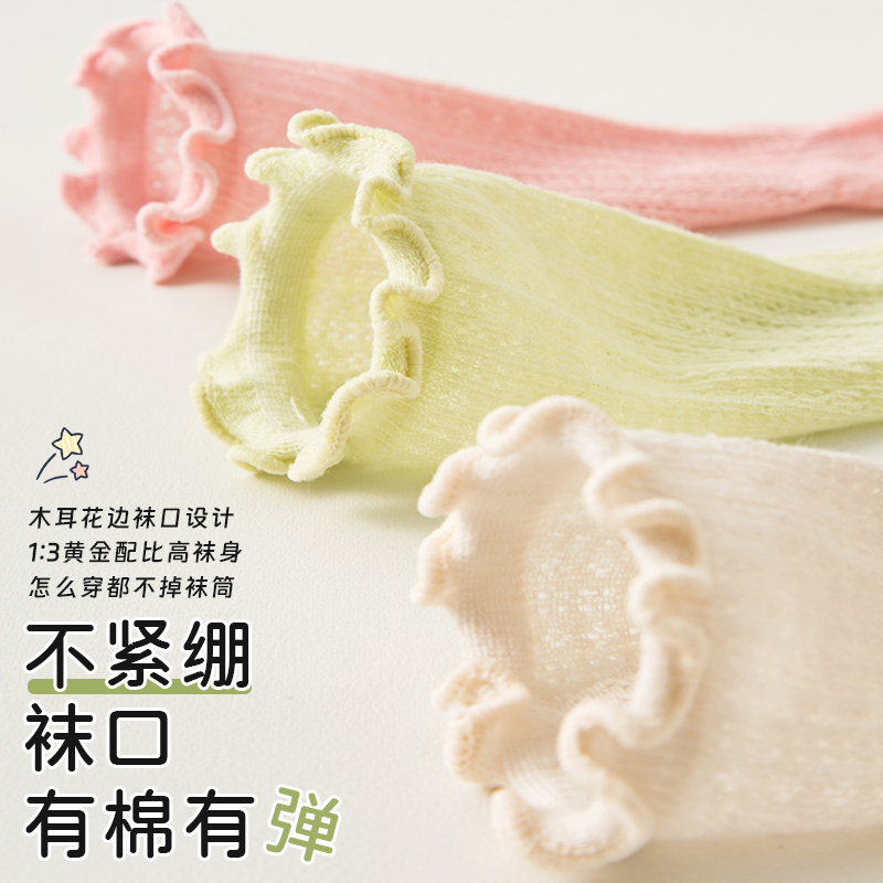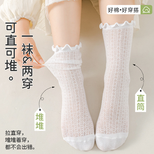 女童袜子夏季 纯棉中筒网眼袜儿童女孩公主花边长筒堆堆袜夏天 薄款
