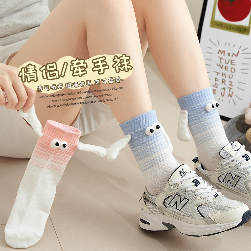 会拉手 可爱搞怪大童中筒袜情侣磁吸可以牵手袜子 袜子女男秋冬款