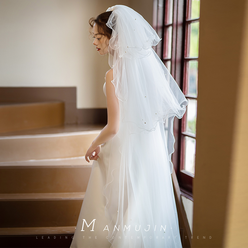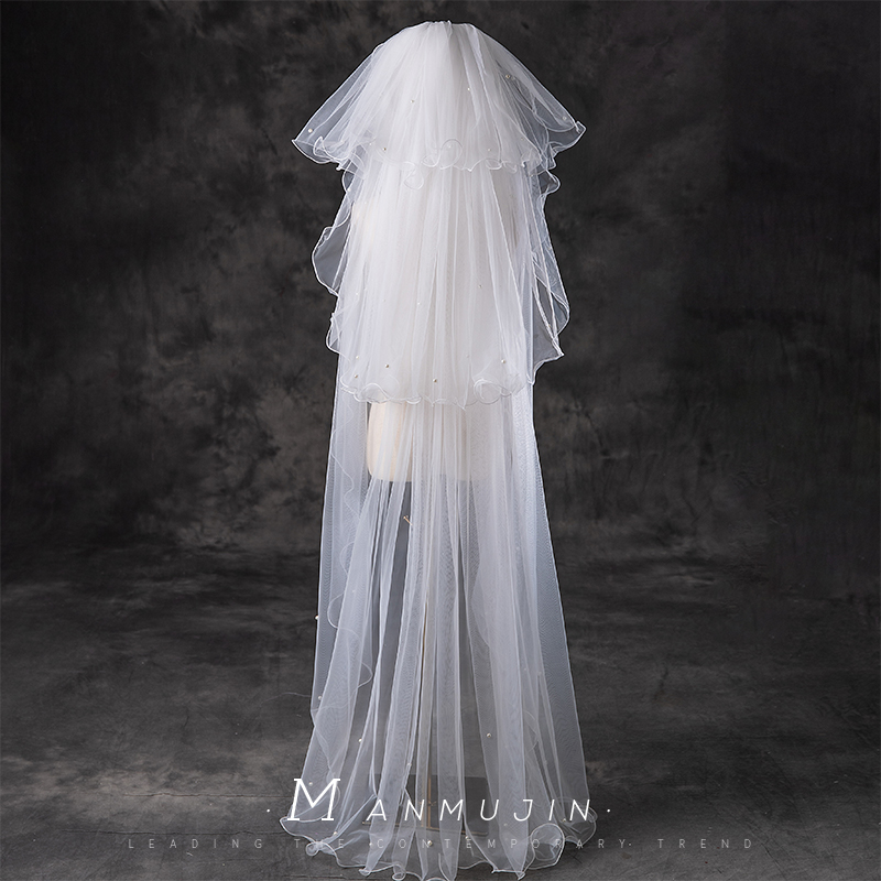 新娘结婚拍照头饰及地中长款 波浪卷边珍珠多层头纱造型软网蓬蓬纱