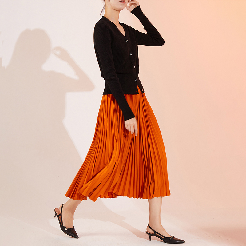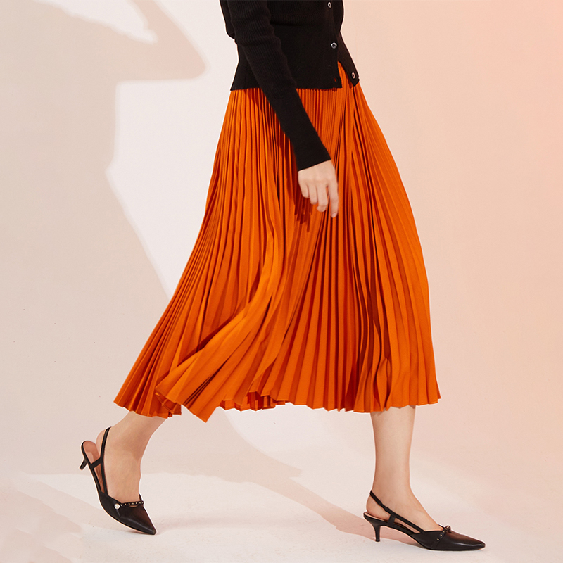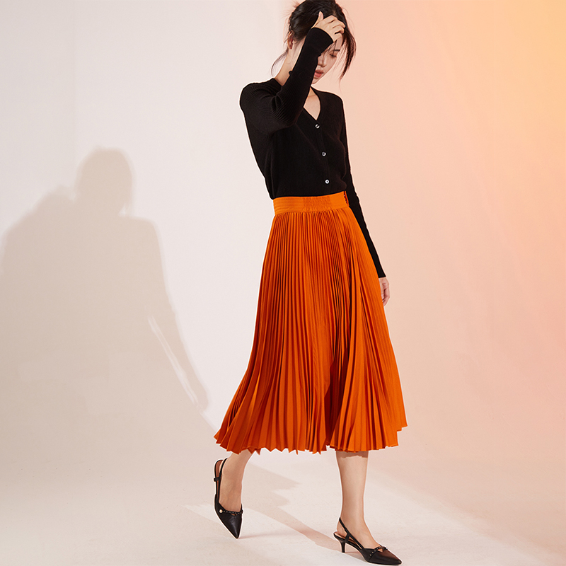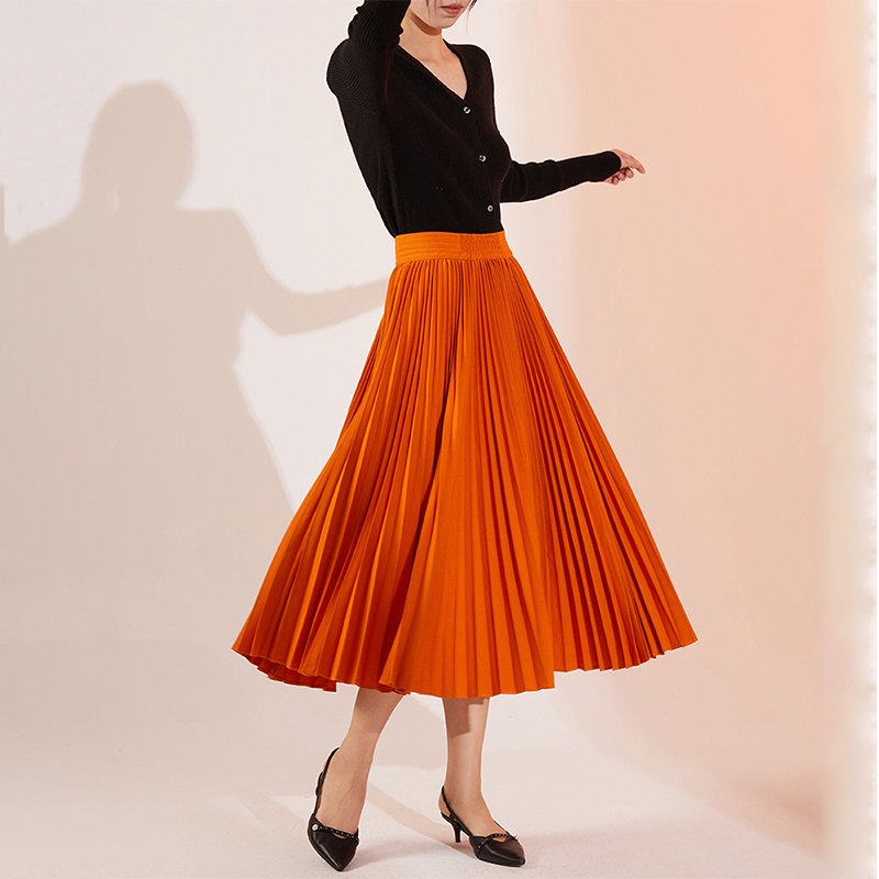 暖橘南瓜色大摆百褶半身裙2025春秋款 女垂坠感高腰显瘦A字中长裙