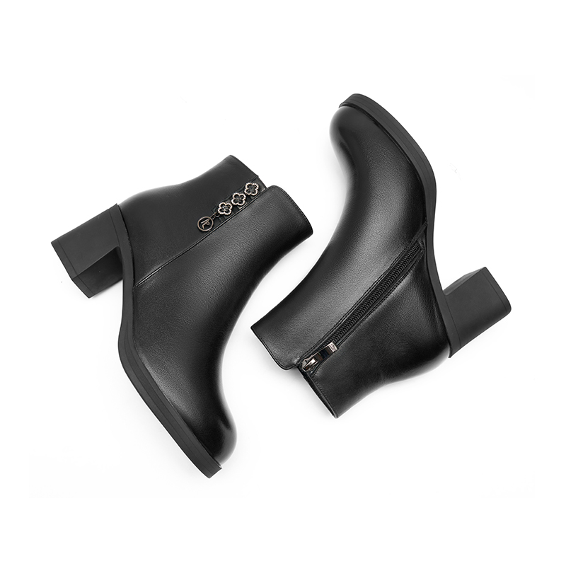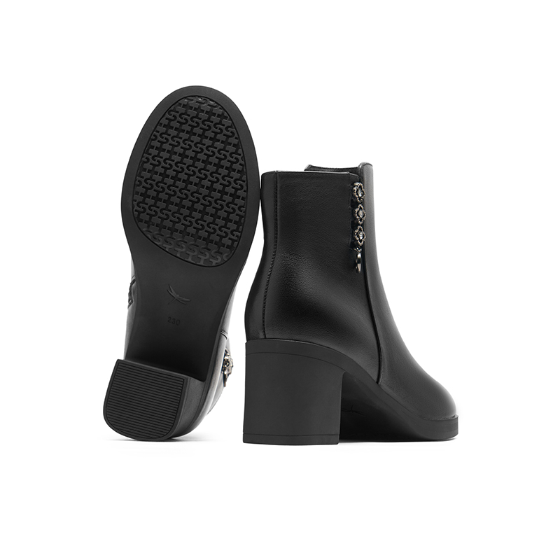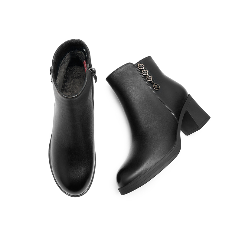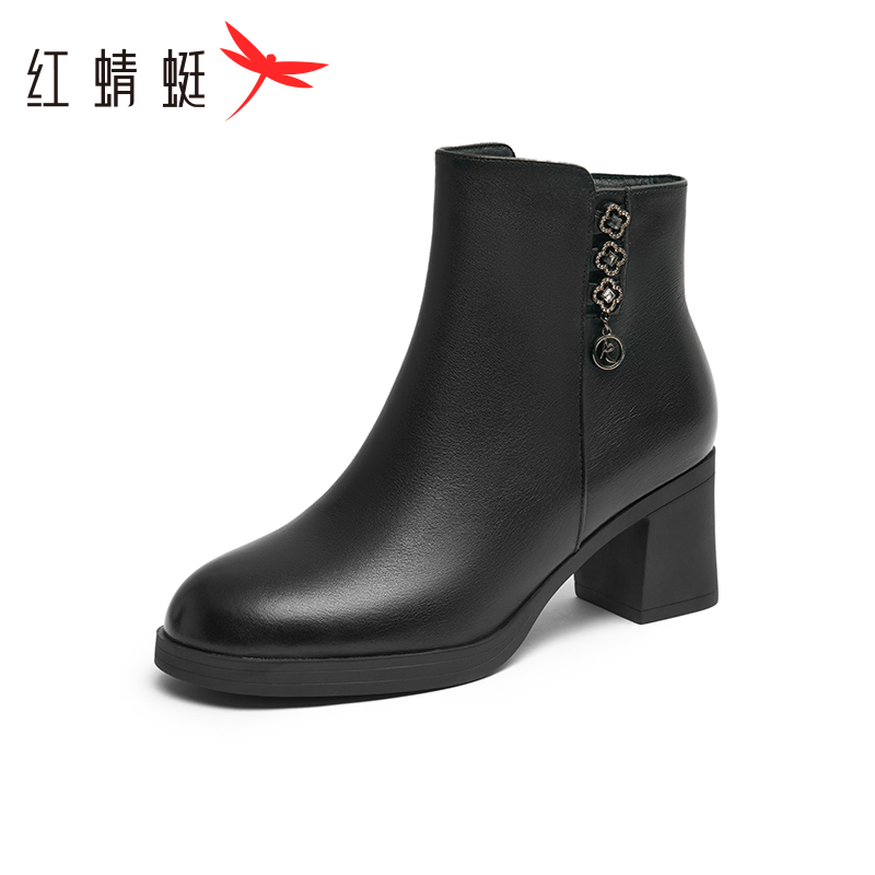 真皮短靴中年女士靴子棉鞋 红蜻蜓皮鞋 秋冬加绒女鞋 妈妈高跟鞋 女款