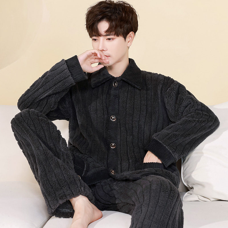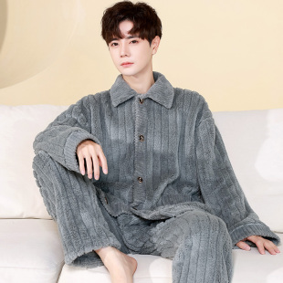 拉链家居服新款 大码 加绒法兰绒套装 可外穿加厚珊瑚绒睡衣男秋冬季