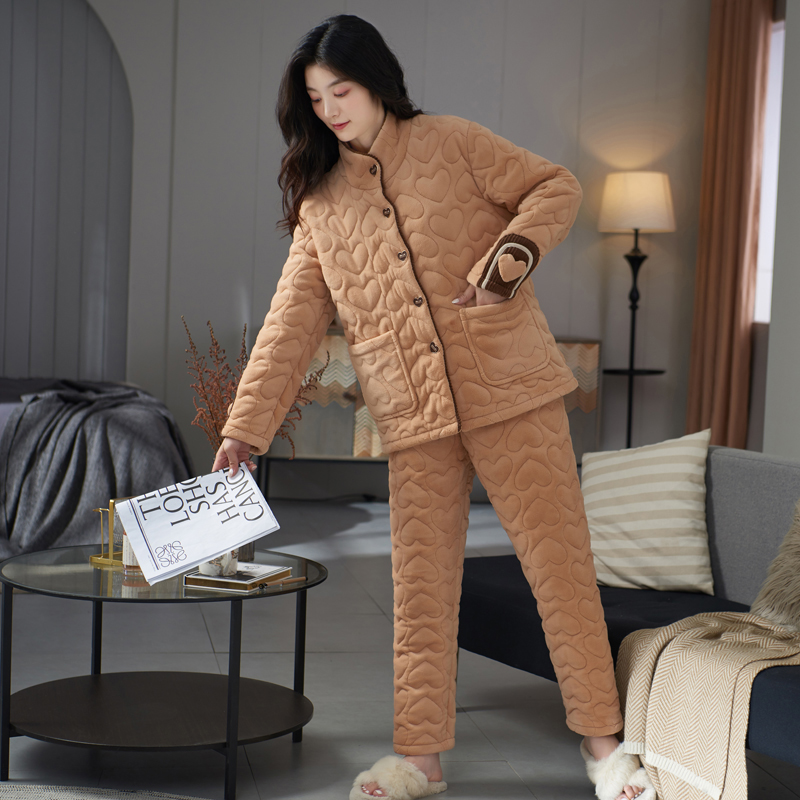 睡衣女秋冬季 珊瑚绒加厚加绒夹棉三层保暖可外穿法兰绒家居服套装