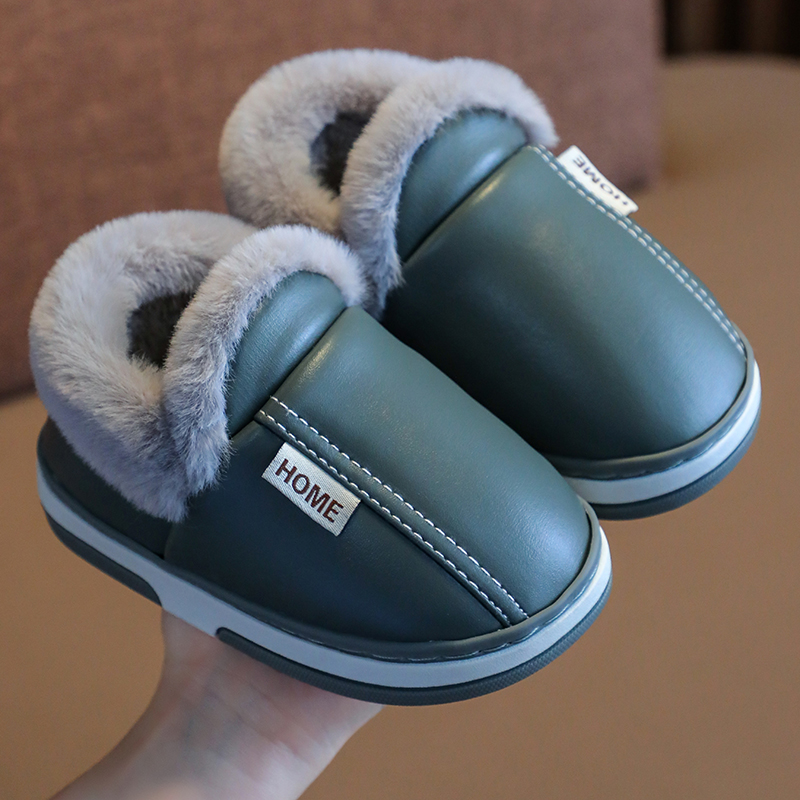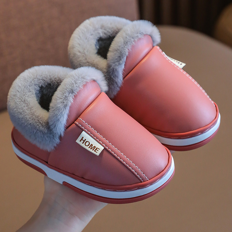 男童皮面防水小孩居家室内女童宝宝加绒保暖棉拖鞋 儿童棉鞋 秋冬季