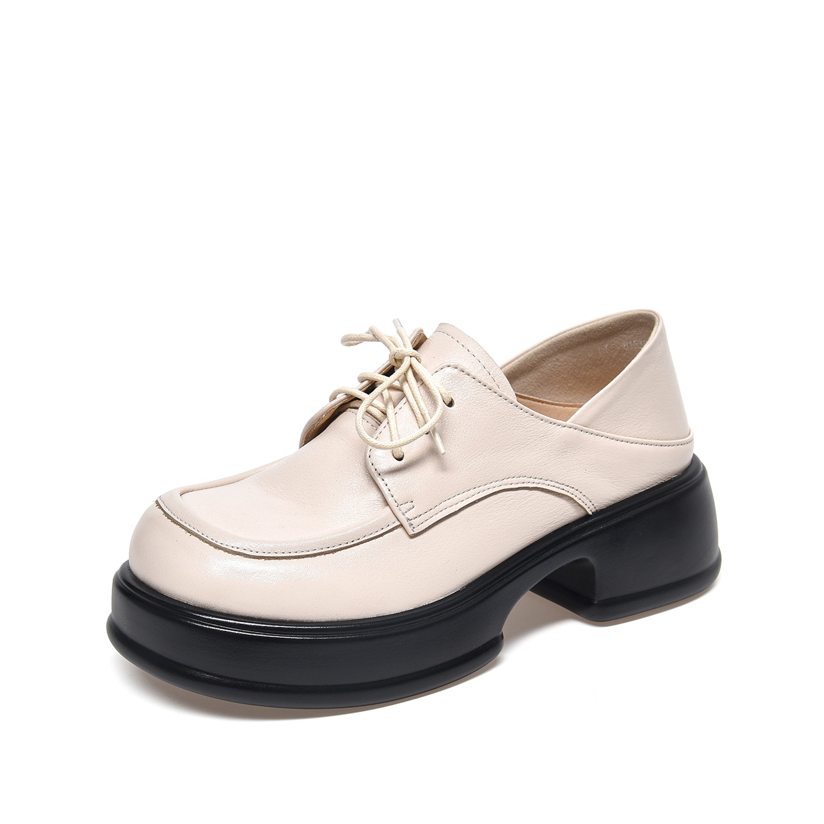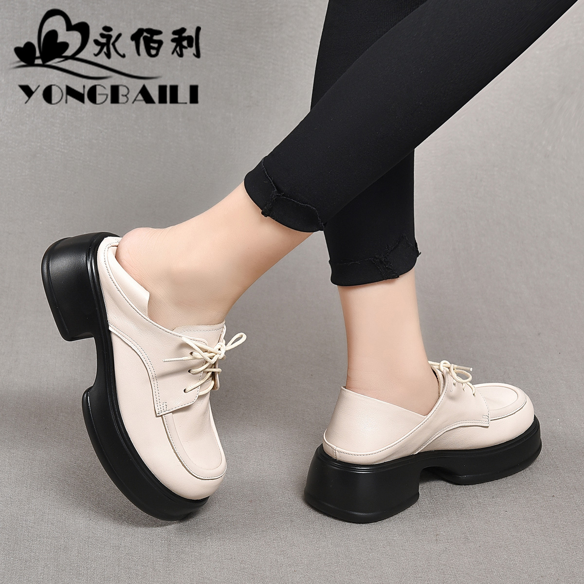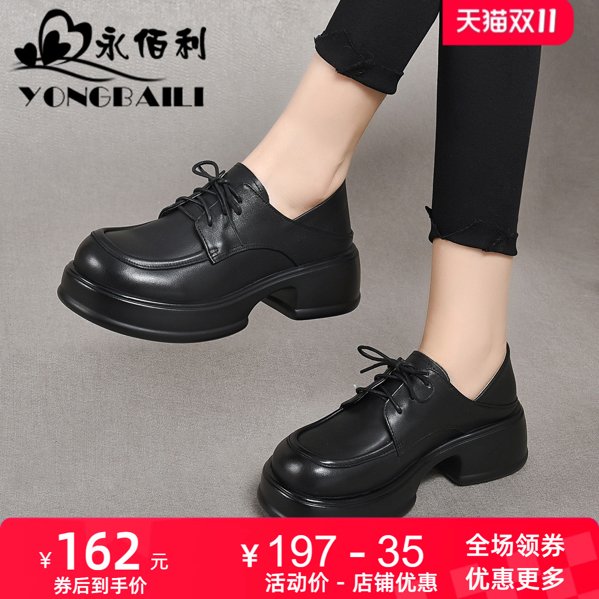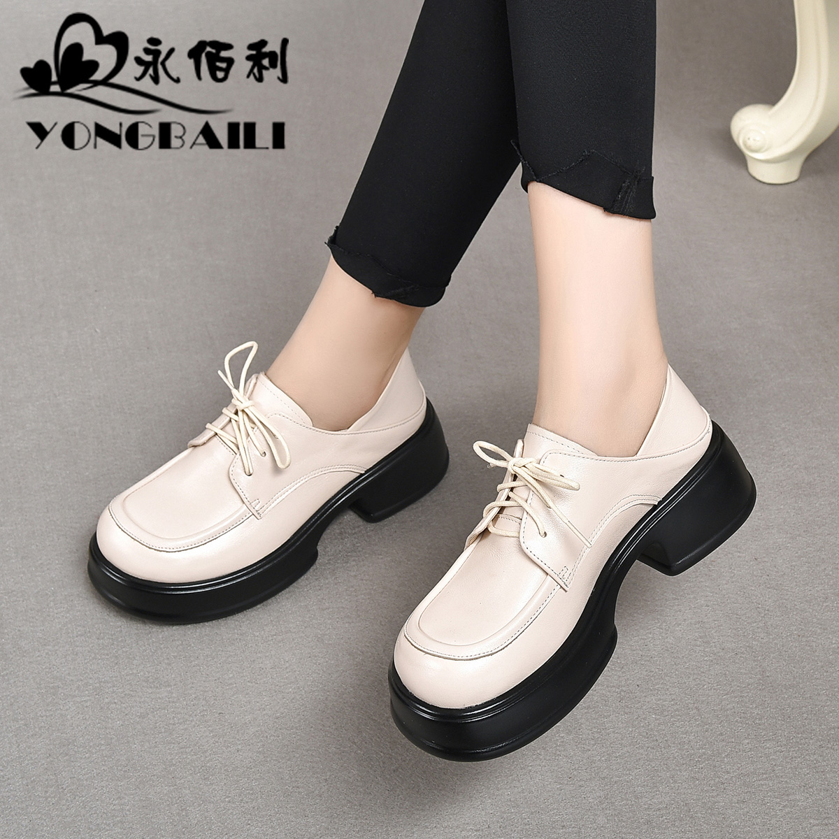 圆头系带软底舒适真皮女鞋 新款 女2025春季 厚底增高牛皮高跟单鞋