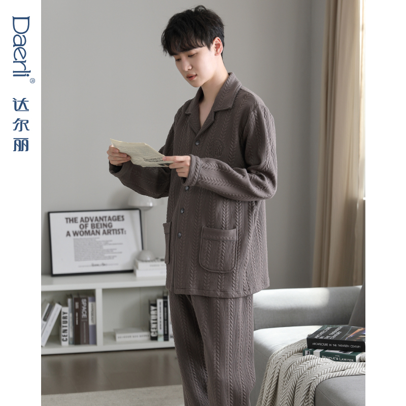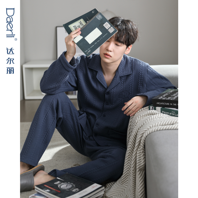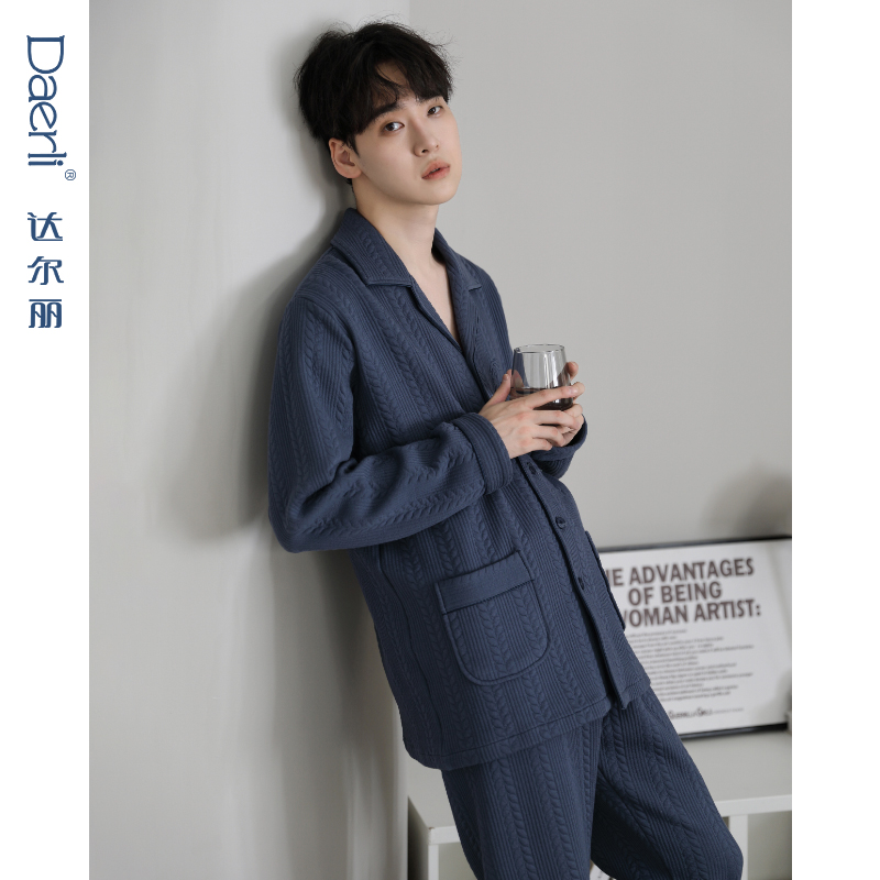 夹棉家居服春秋套装 三层空气棉长袖 保暖厚款 达尔丽夹层睡衣男冬季