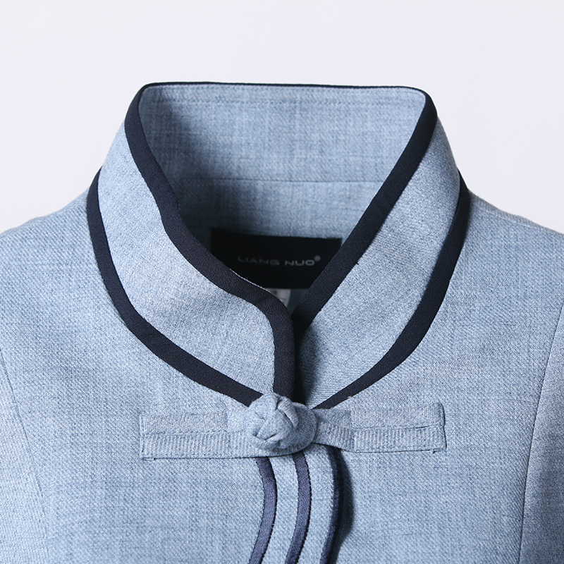 LF20127A LIANGNUO靓诺淡蓝色门襟绣线风衣V领气质中长款 新中式