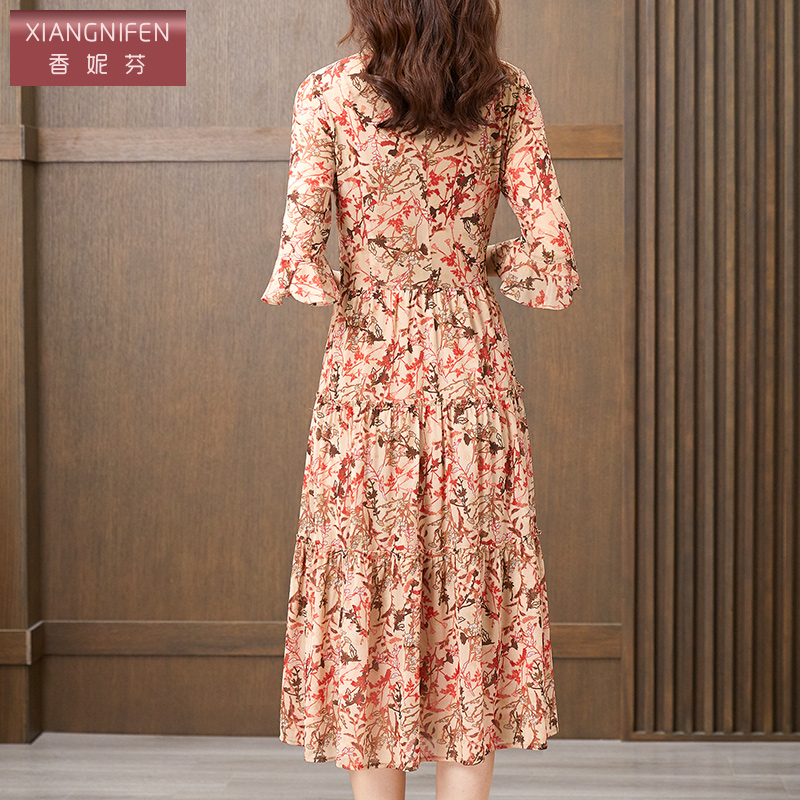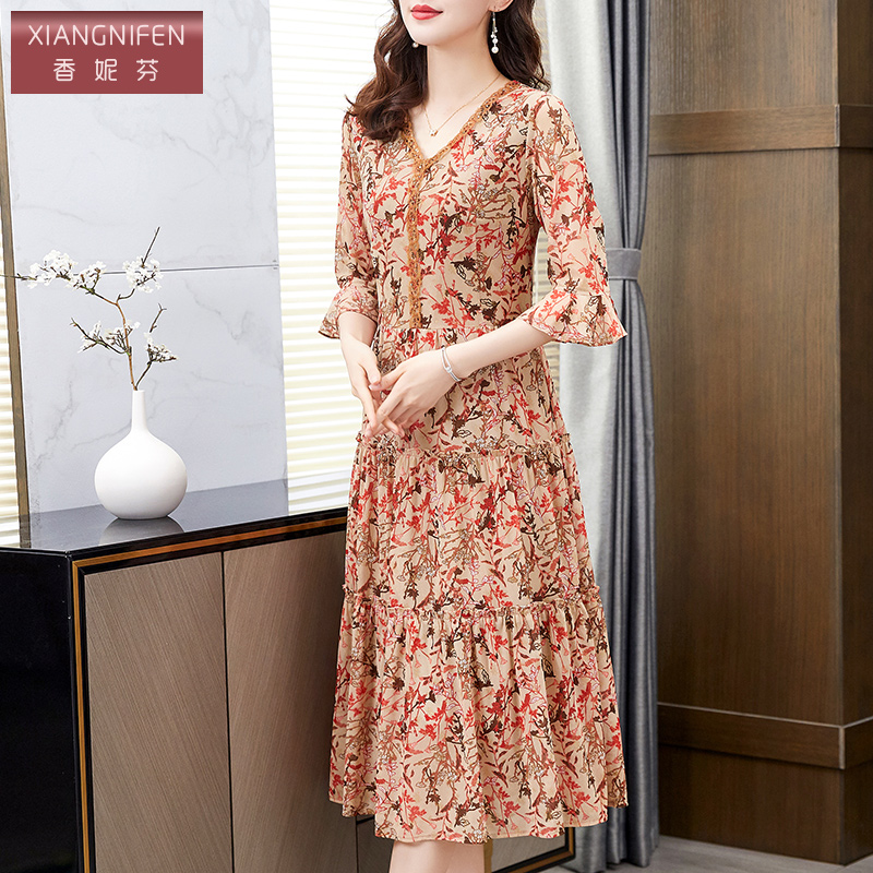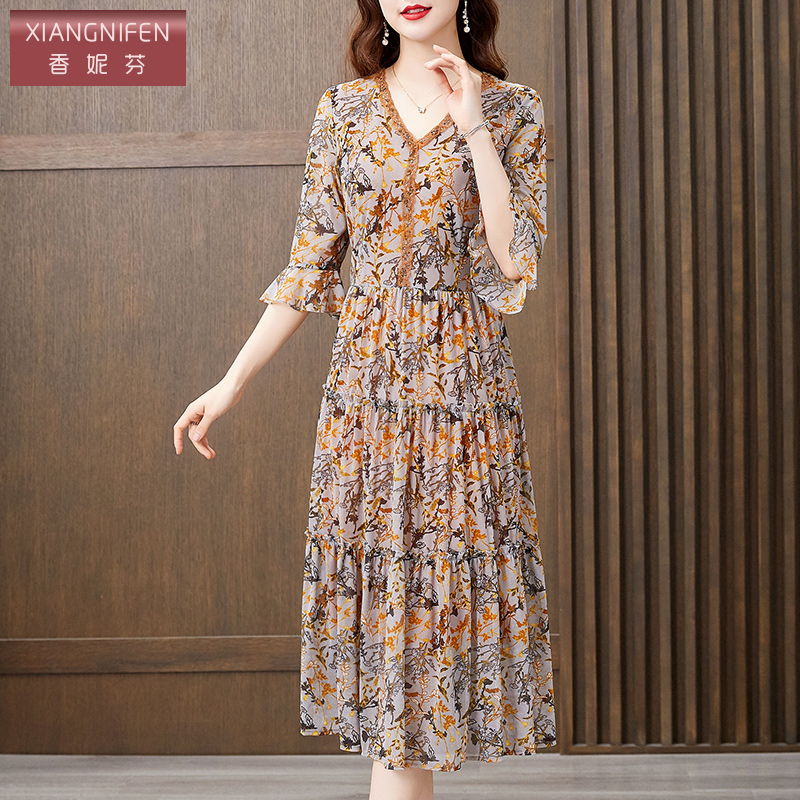 复古裙 中袖 香妮芬气质洋气v领中年妈妈台湾纱连衣裙2025新款 夏季