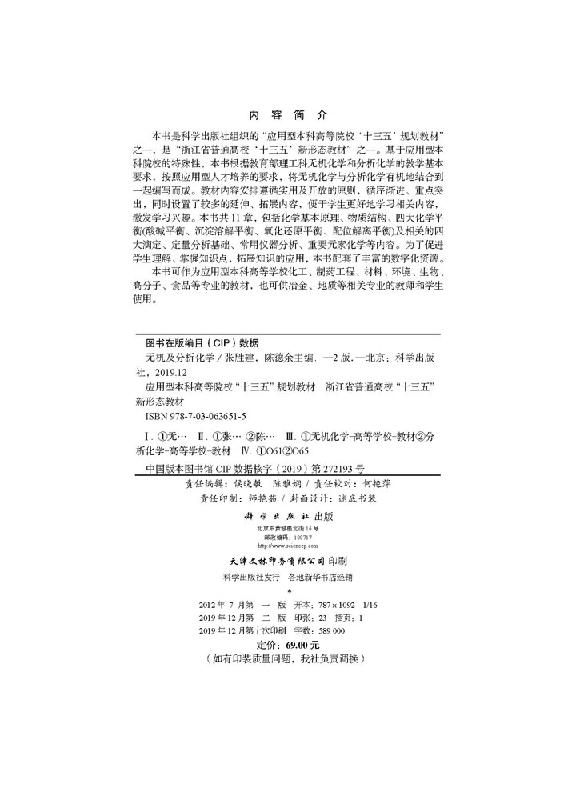 科学出版 9787030636515 陈德余 物质结构 四大化学平衡 化学基本原理 张胜建 主编 社 无机及分析化学 常用仪器分析 第二版