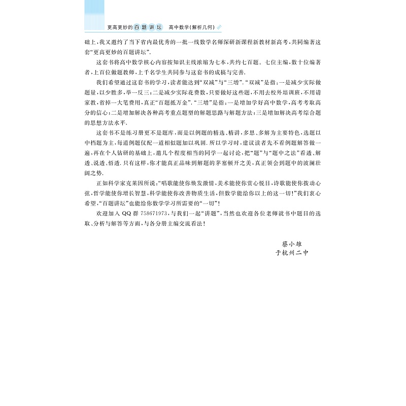 适用于高2高3学生 高中数学.解析几何 蔡小雄 刘美良 社 更高更妙 浙江大学出版 百题讲坛