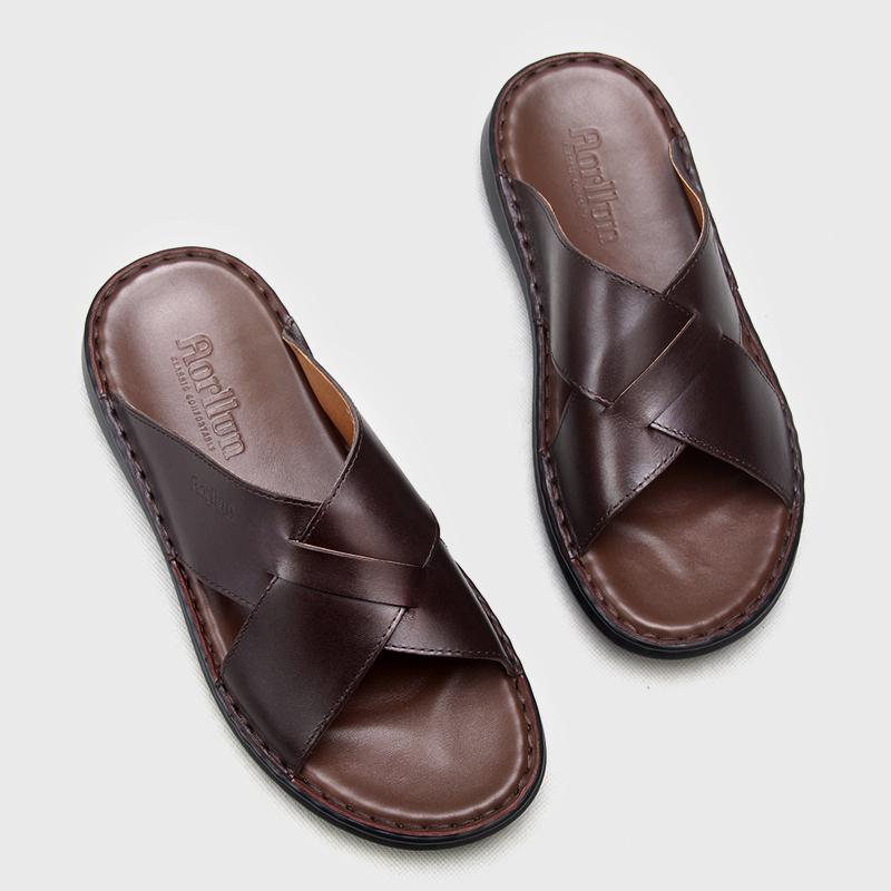 外穿拖鞋 简约舒适一字拖男士 男真皮手工缝线高档凉拖鞋 牛皮拖鞋