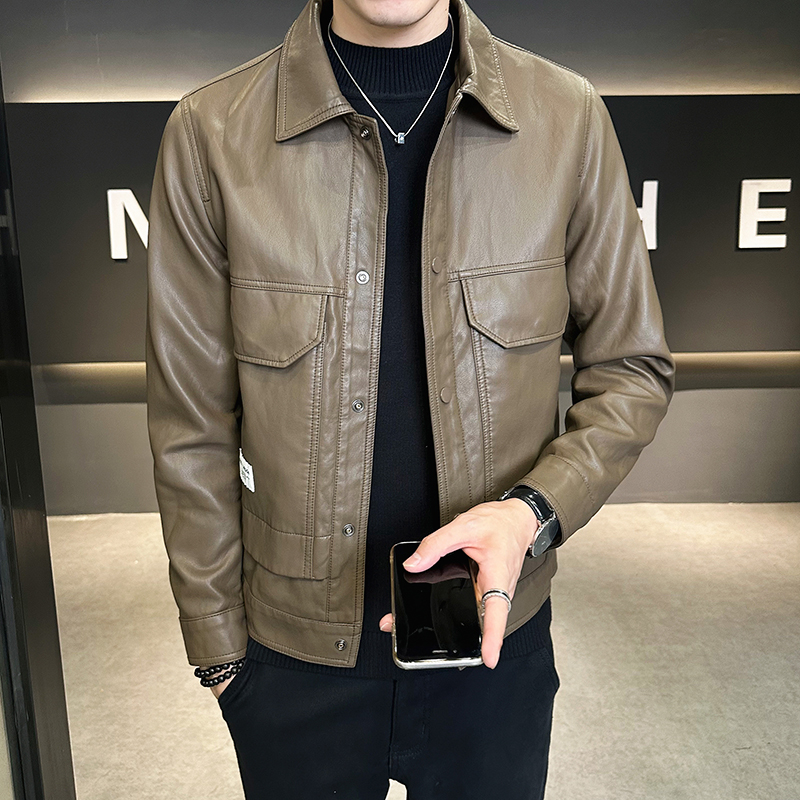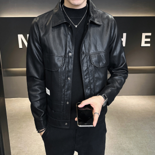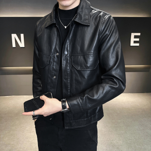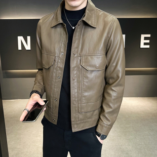 复古男装 机车皮衣男士 短款 棕色PU皮修身 衣服外套 夹克2025春秋新款