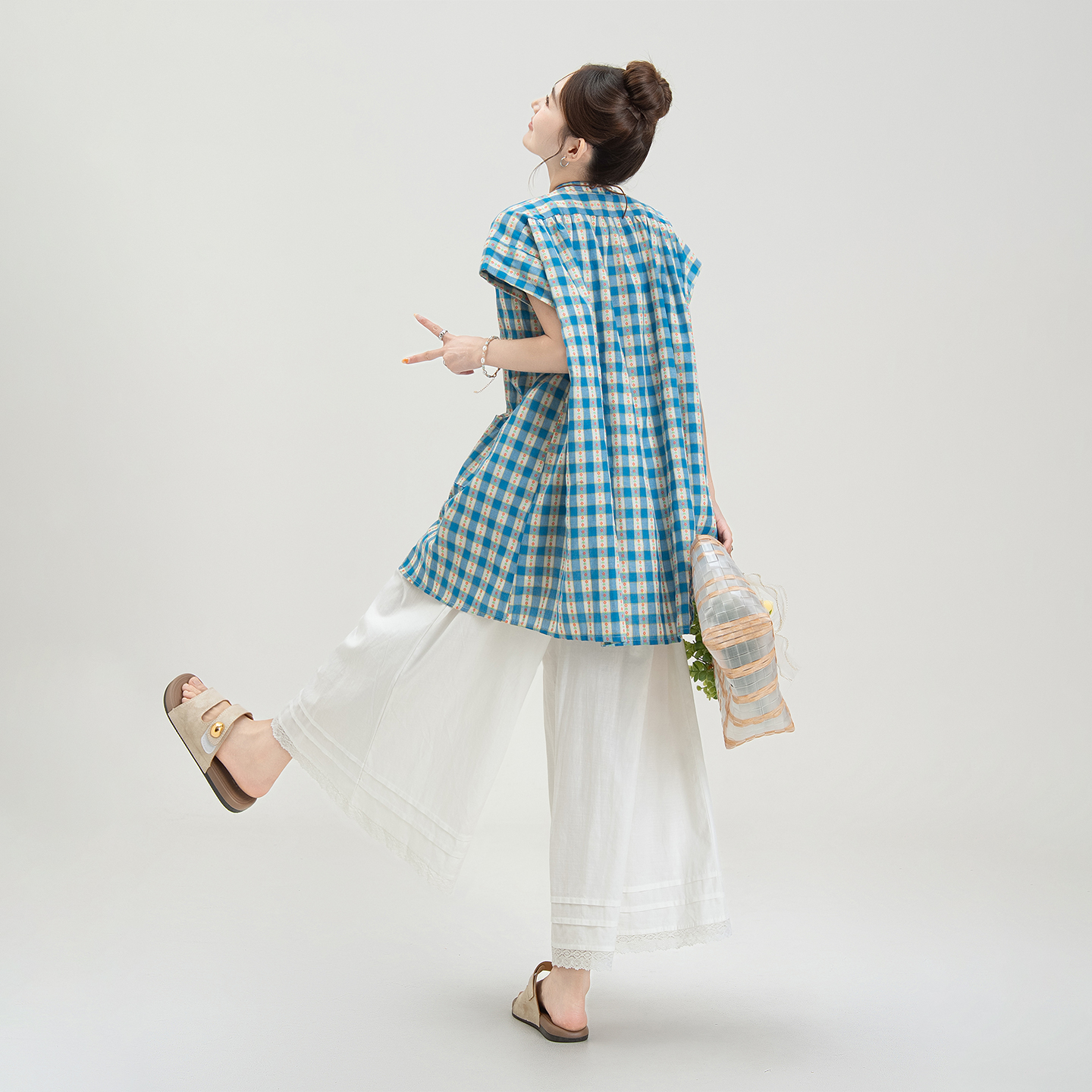 衬衫 套装 女夏季 叠穿蕾丝拼接宽松阔腿裤 新款 蓝色复古格纹碎花短袖