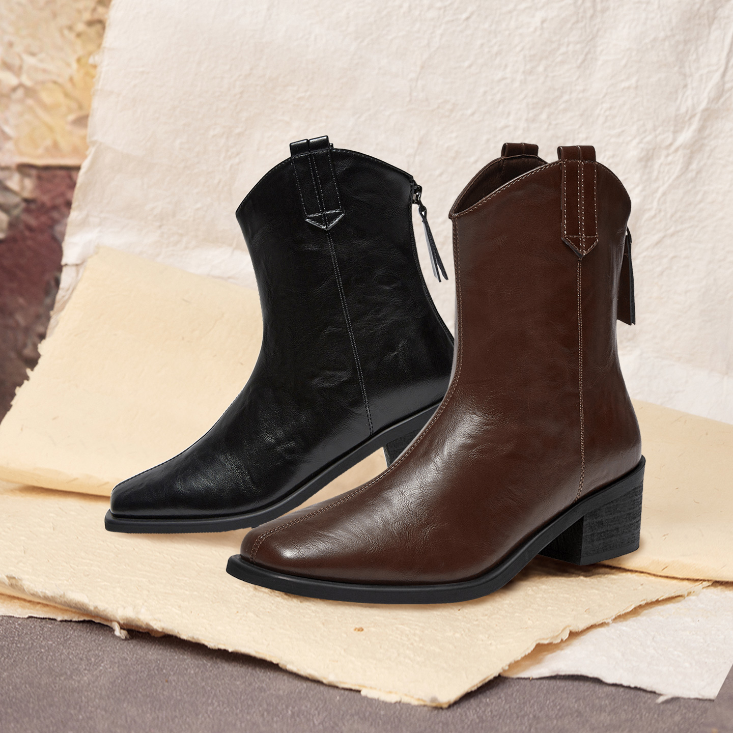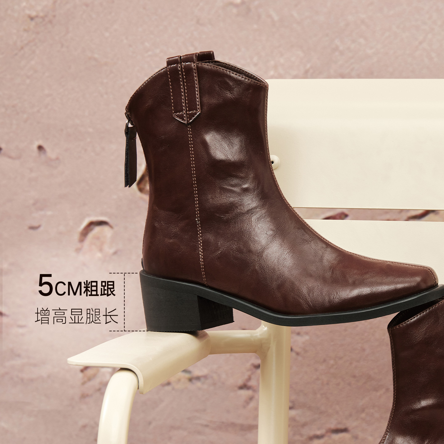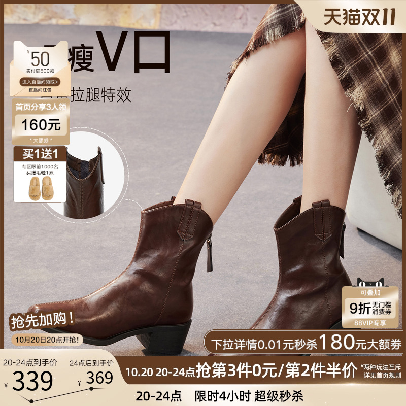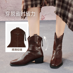 百思图2025冬商场新款 气质显瘦V口骑士短靴粗跟女马丁靴B7206DZ5