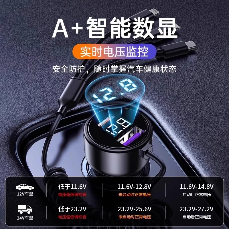 车载充电器伸缩线超级快充2025新款 一拖二点烟器120w适用华为小米
