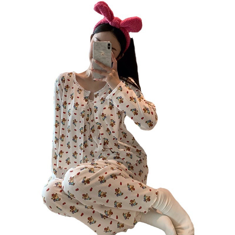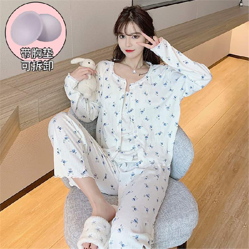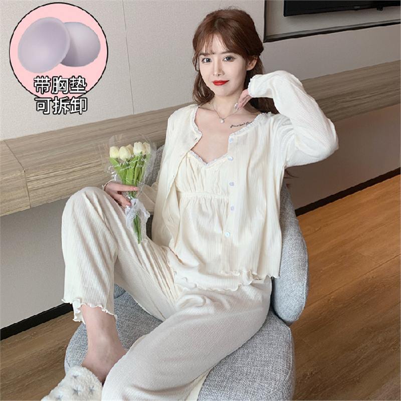 吊带长裤 跨境带胸垫睡衣女春秋季 6535棉开衫 韩版 三件套家居服 新款
