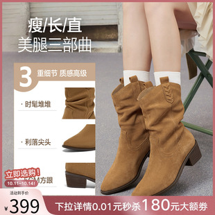 美拉德西部牛仔堆堆短靴女 百思图西部旅人25冬新款 张碧晨同款