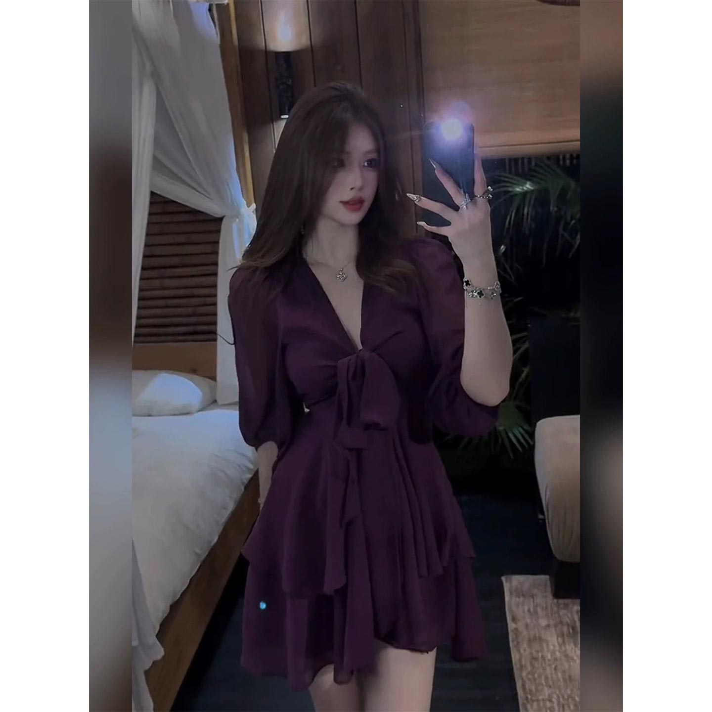 v领长袖 2025新款 显瘦休闲收腰气质短裙胖mm 碎花连衣裙女秋季 大码