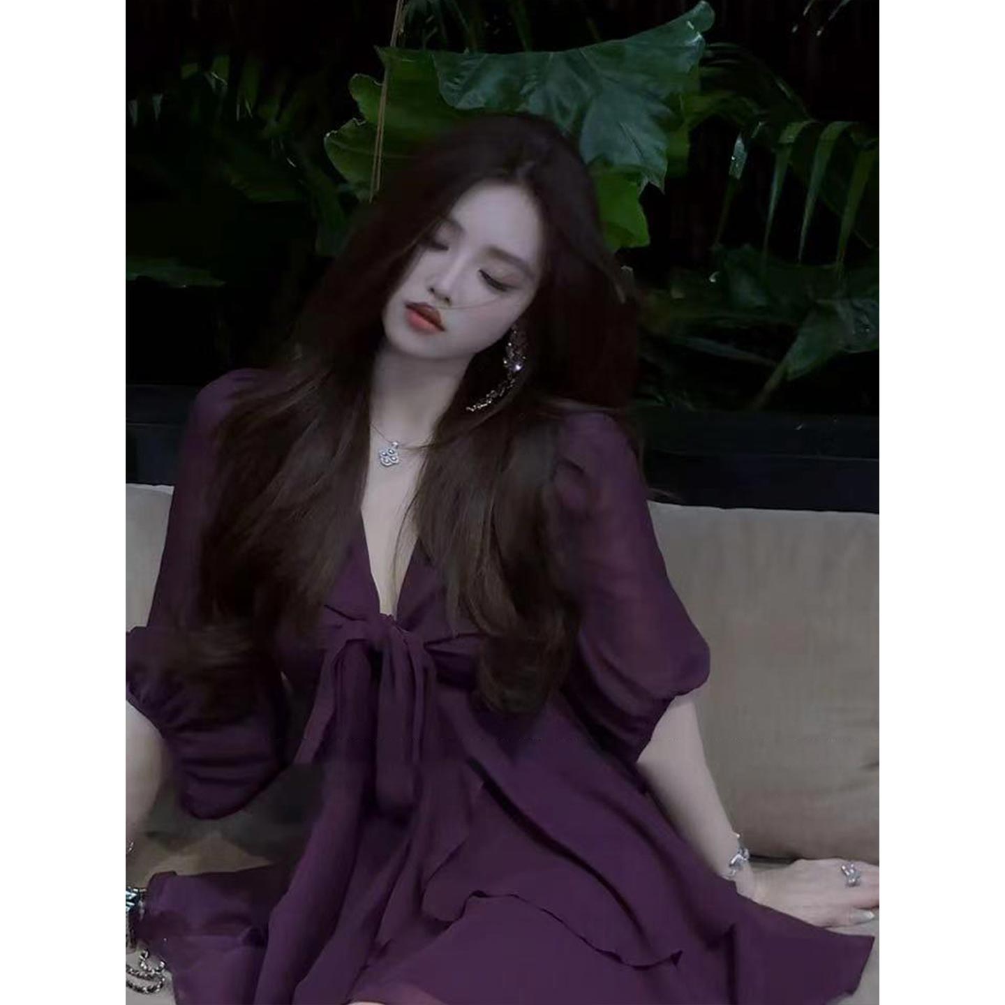 高级感泡泡袖 复古方领白色仙女连衣裙女夏季 茶歇雪纺长裙 法式 大码