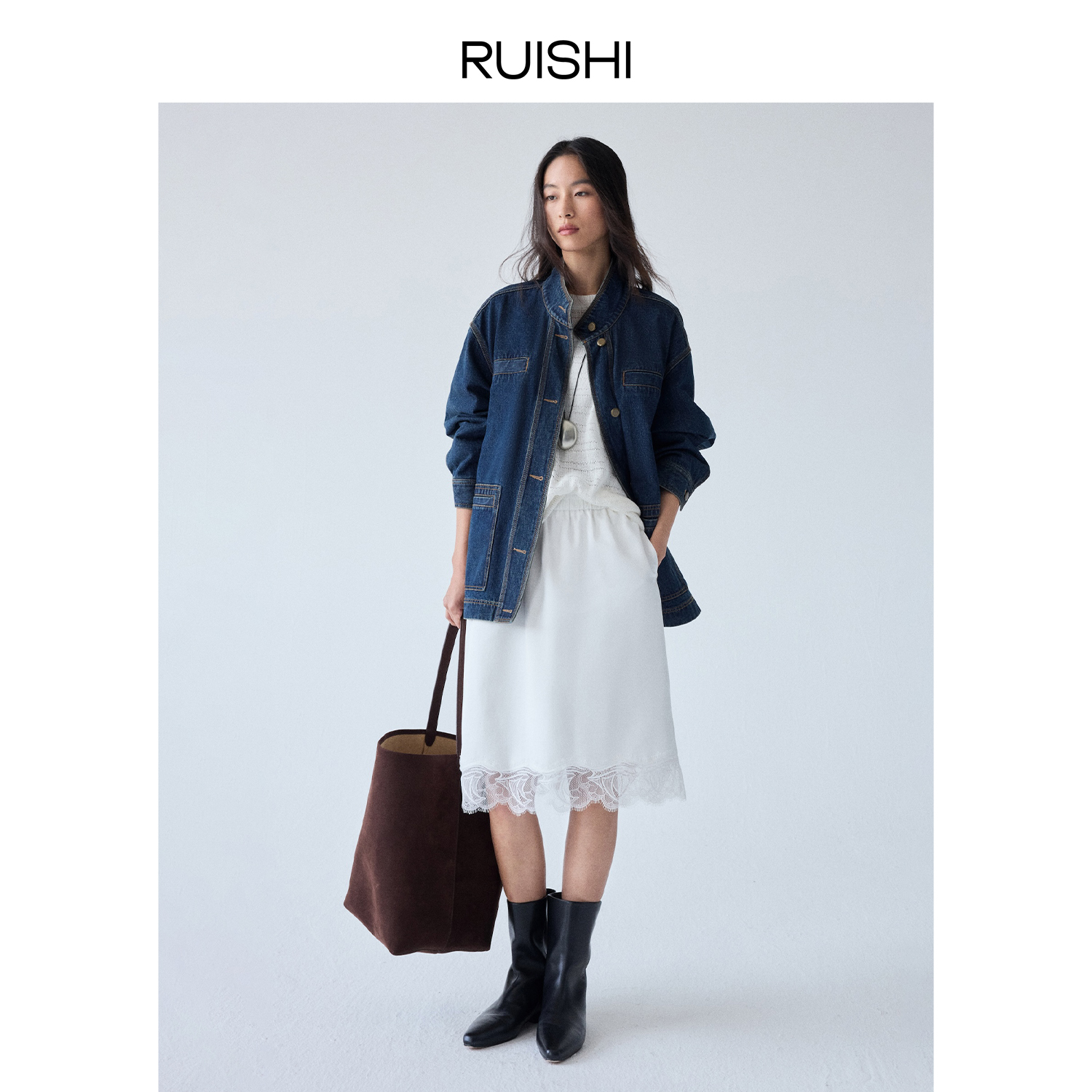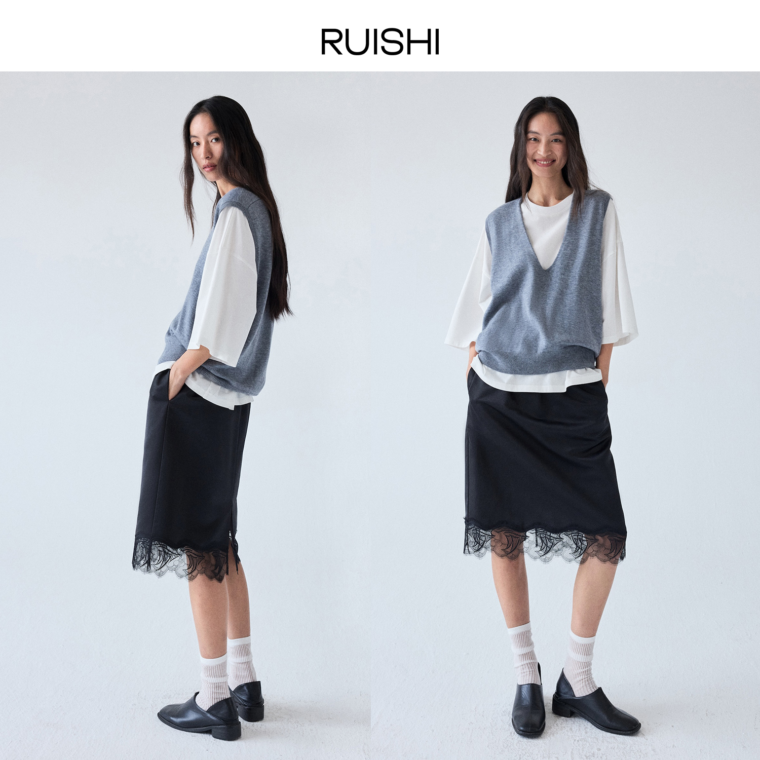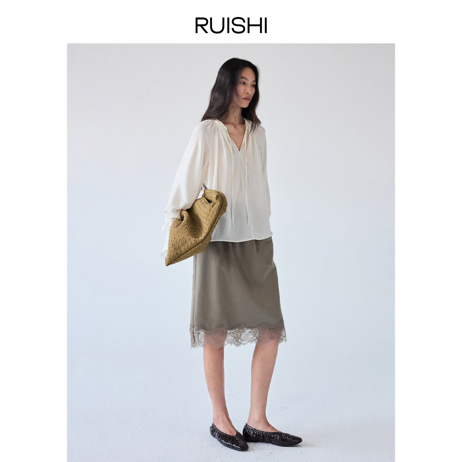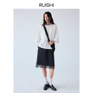 RUISHI芮时 莱赛尔定位蕾丝拼接直筒半身裙柔焦感缎面短裙女夏